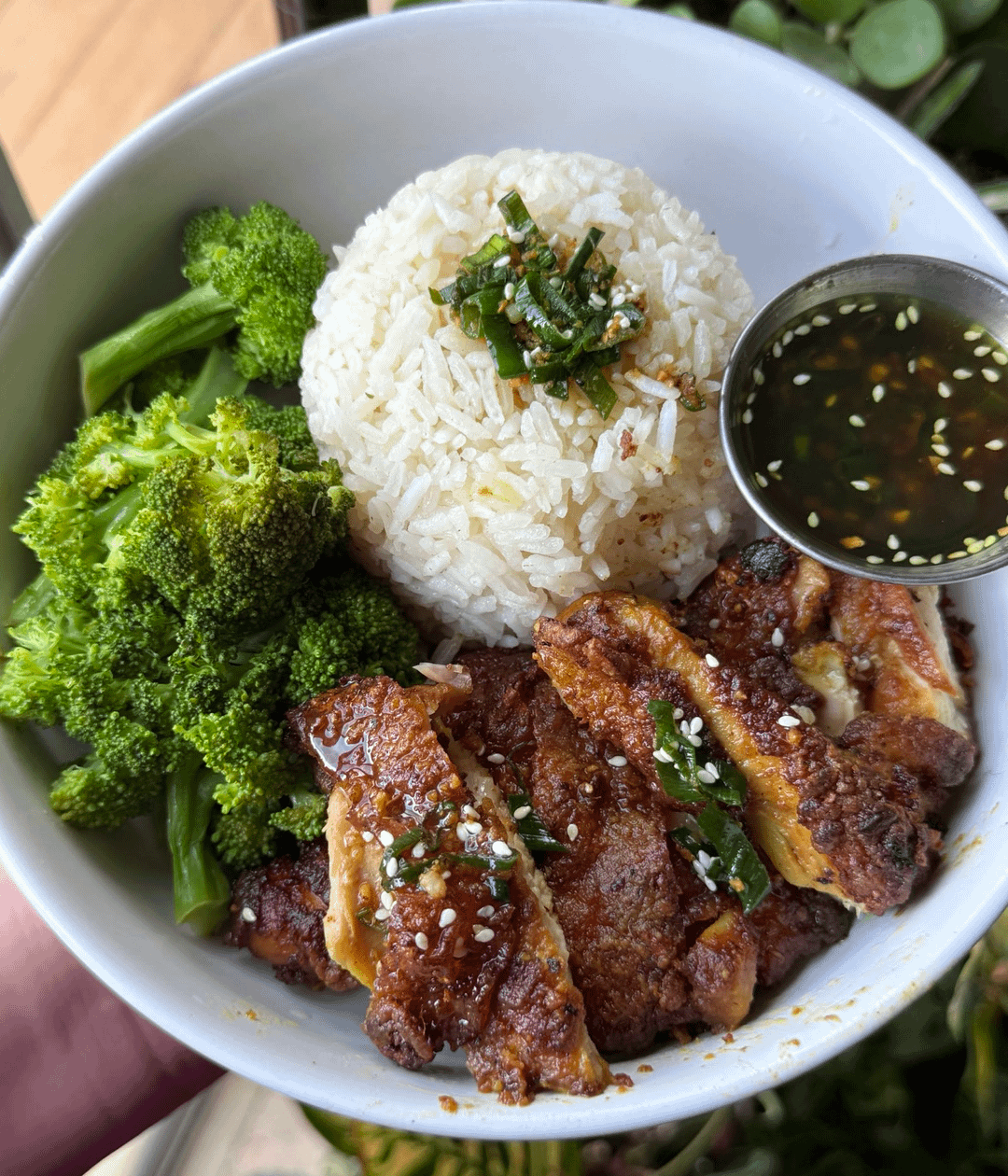 Jasmine rice is cooked in chicken stock. Sautéed shallots and garlic in schmaltz. After they’ve softened, I toast the rice until it smells nutty. Add chicken and chicken knorr seasoning. Bring to boil, drop to low, cover and cook for 18 mins. Wait 5-10 mins after cooking before removing lid and fluffing.
