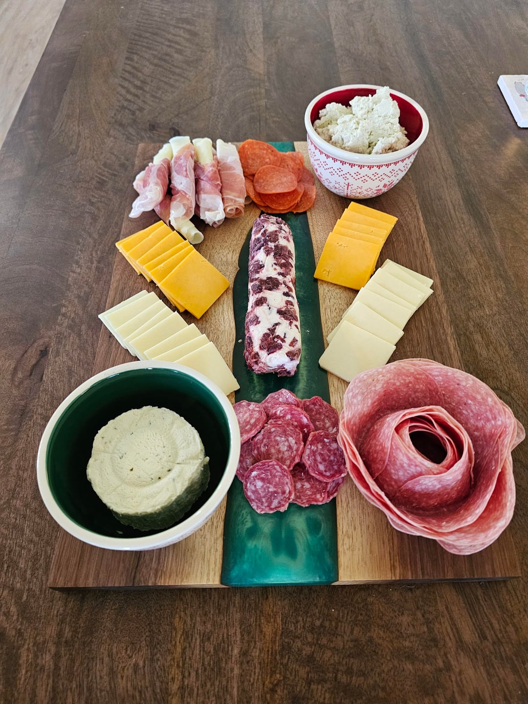 I am going to go against the grain and say I do like symmetry on my board. With that being said, I think if you cut up the goat cheese and made the focal point the meat flower and also had smaller, matching bowls. It could help bring everything g together. I do love my board hammer packed and try to always have at least 3 kinds of meat,3 kinds of cheese, jam and or honey, fresh fruits, 1 dried fruit, a nut option and some crackers and bread. Bonus I like to sneak in some sweet treats like chocolate too! This is a great start tho and how I would make a casual board for a quick dinner night.
