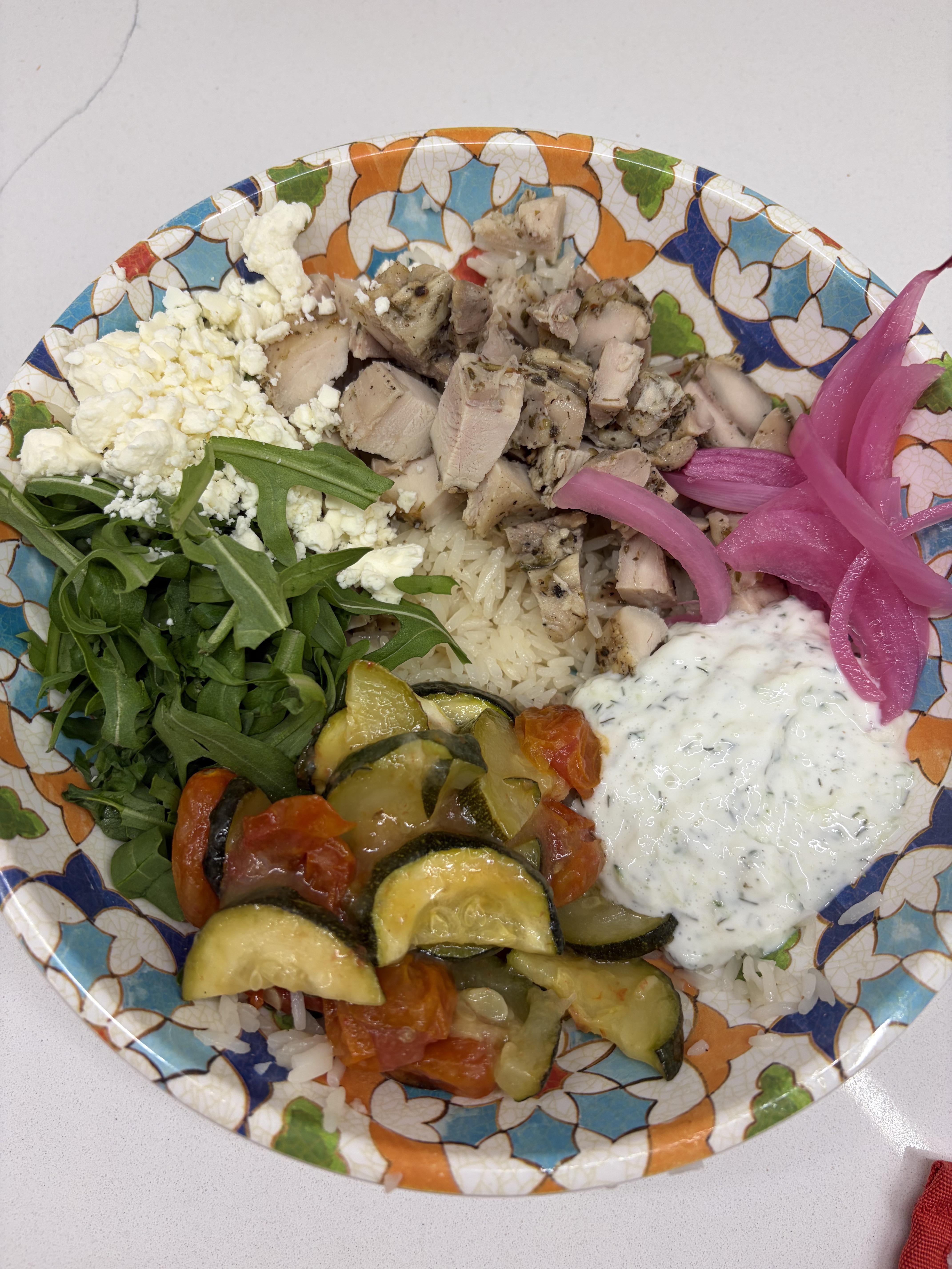 Greek chicken bowls with rice, arugula, roasted zucchini and tomatoes, pickled onions, tzatziki, and feta by hellrodkc Dinner Tonight Tonight's Dinner