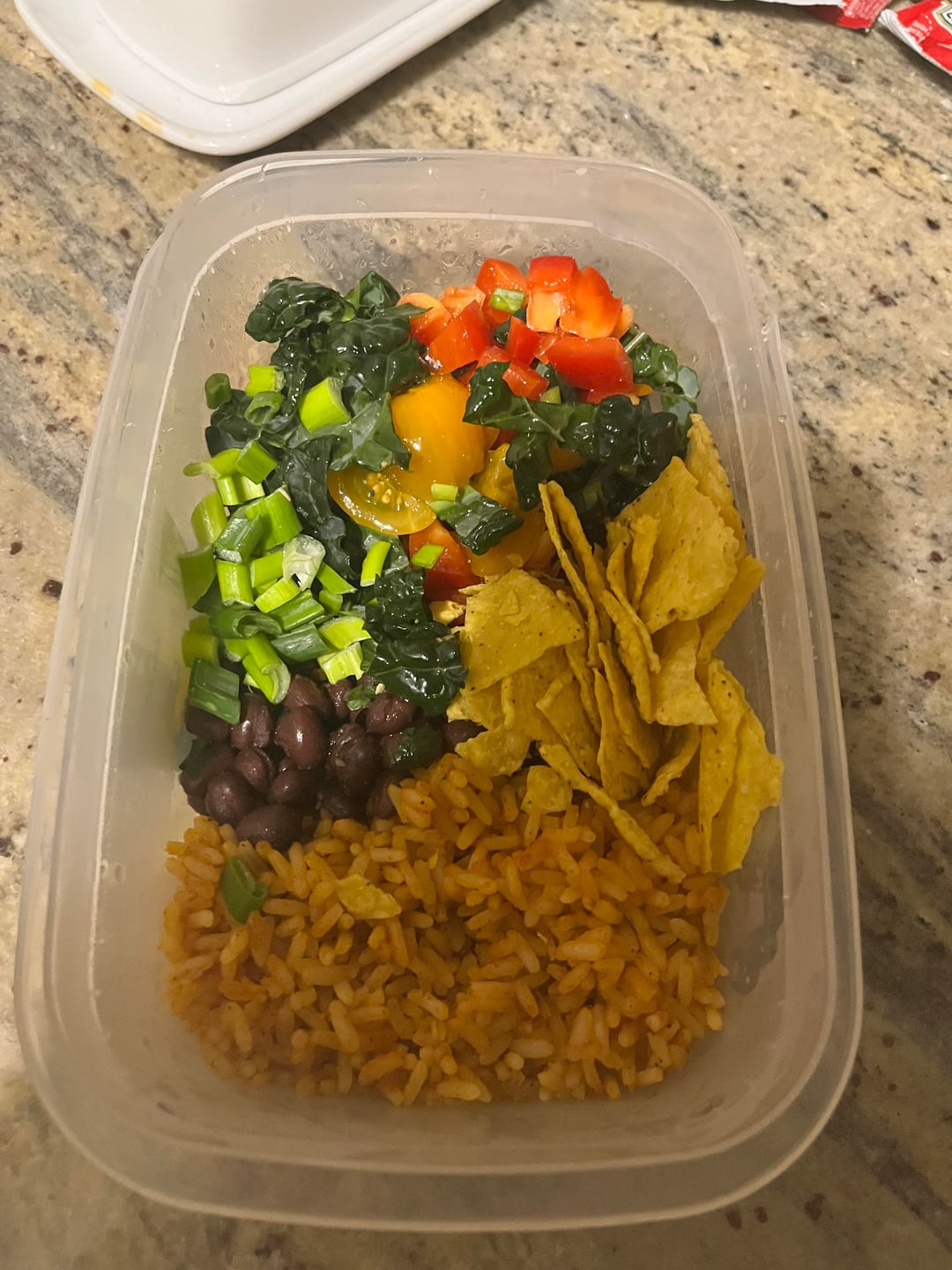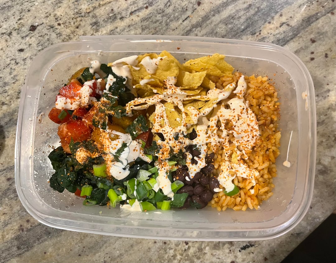 TJs frozen Spanish rice (a life saver that my gf makes fun of me for since rice is so easy but who wants to clean another pan), black beans with lime, cumin, and parsley, green onions, tortilla chips, shredded cheese, a little salad with tomatoes, kale, and red peppers with red wine vinegar/oil, all covered in a ton of like juice, tajin, and crème fraîche mixed with hot sauce