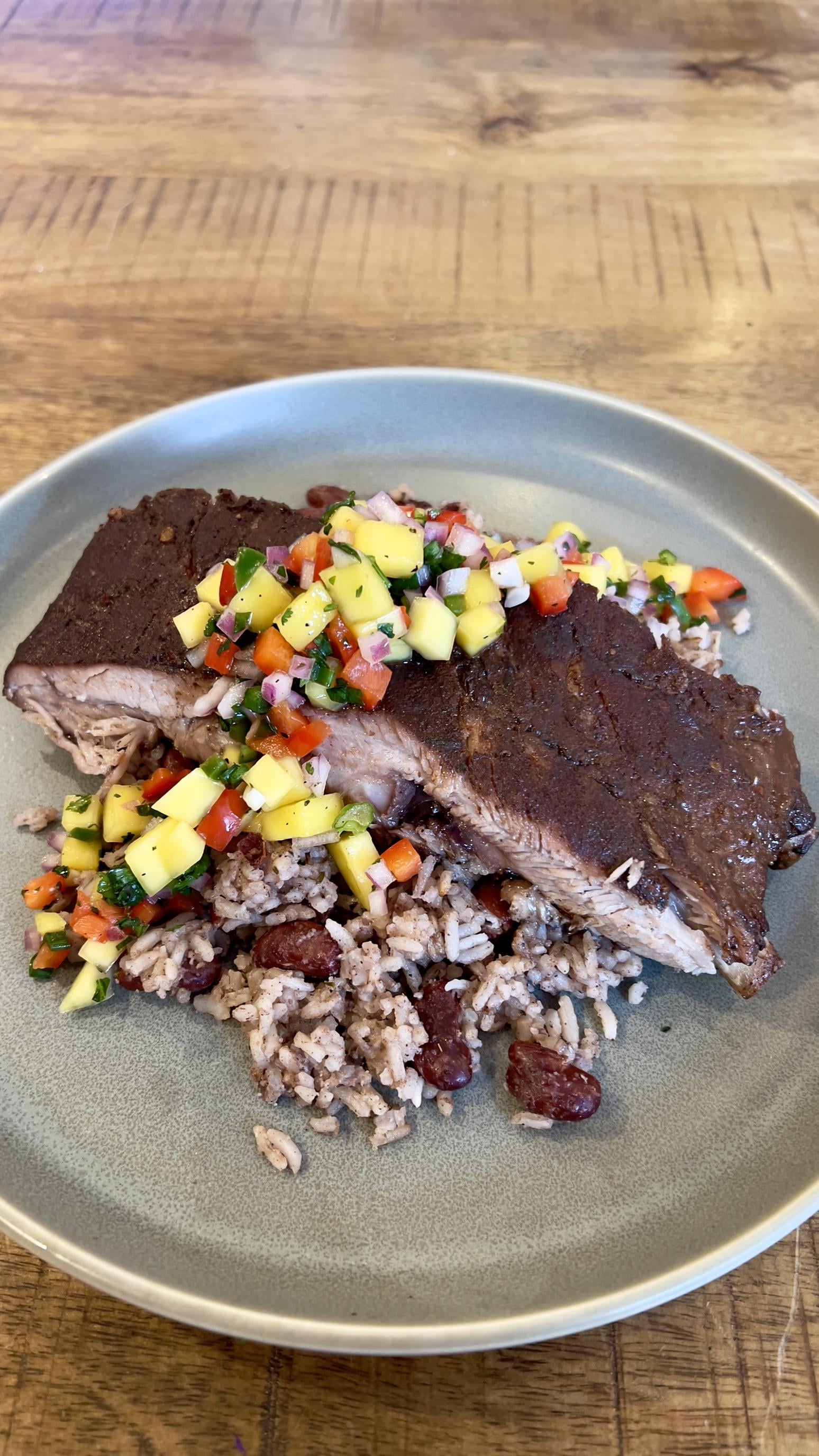 [Homemade] 48hr jerk dry rubbed spare ribs glazed in a jerk bbq sauce, coconut rice + beans, mango salsa ✌🏼 by CrumblinErb23 Food