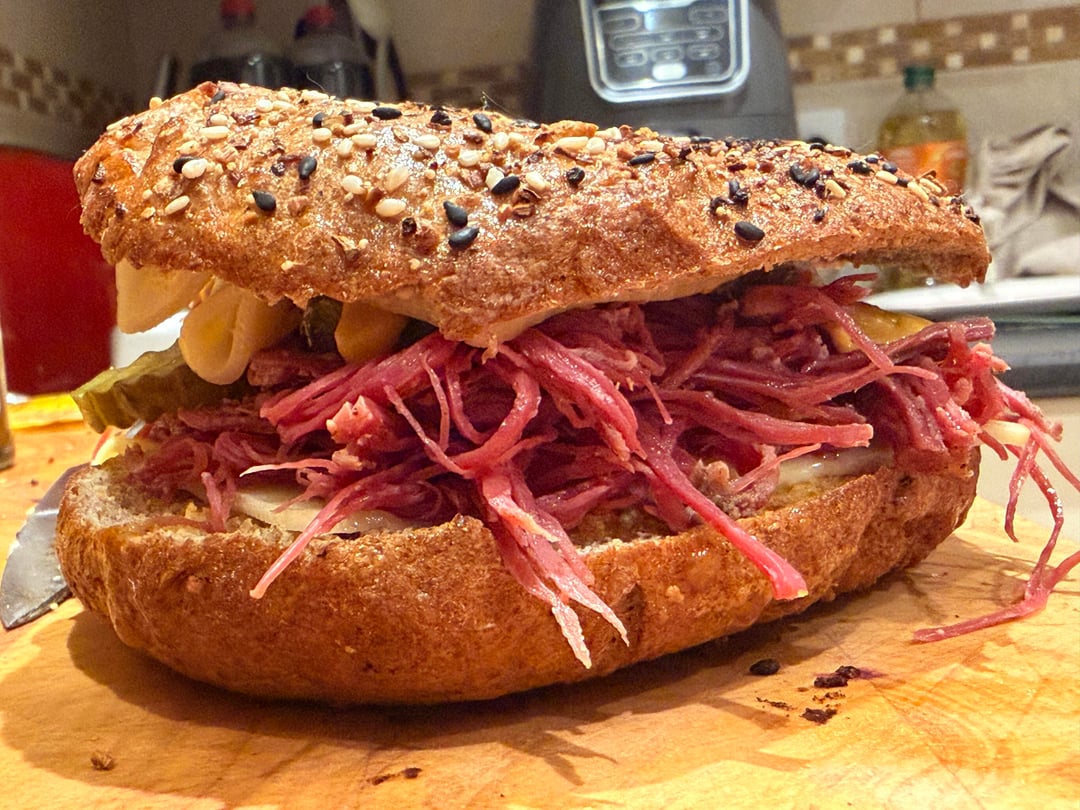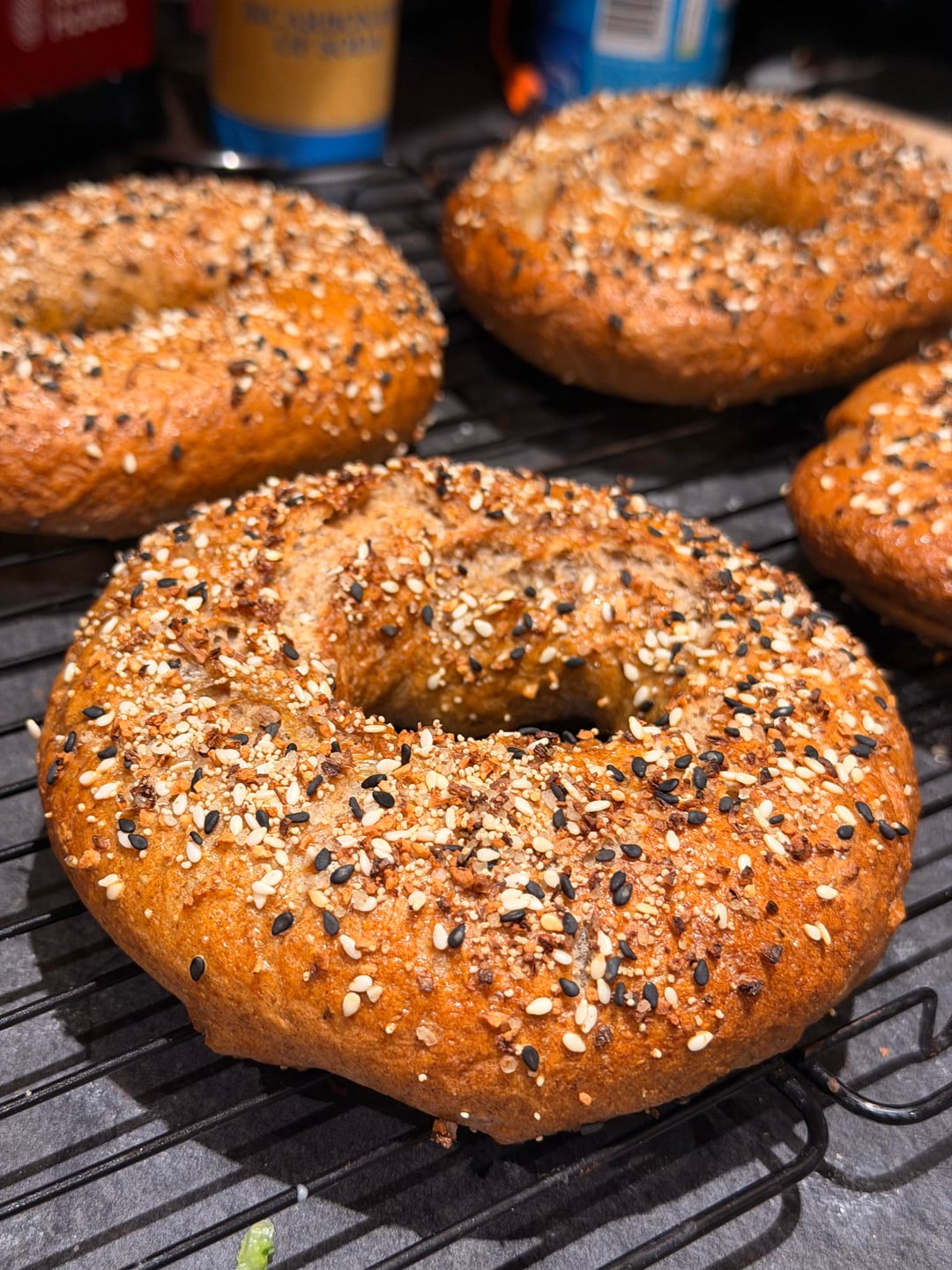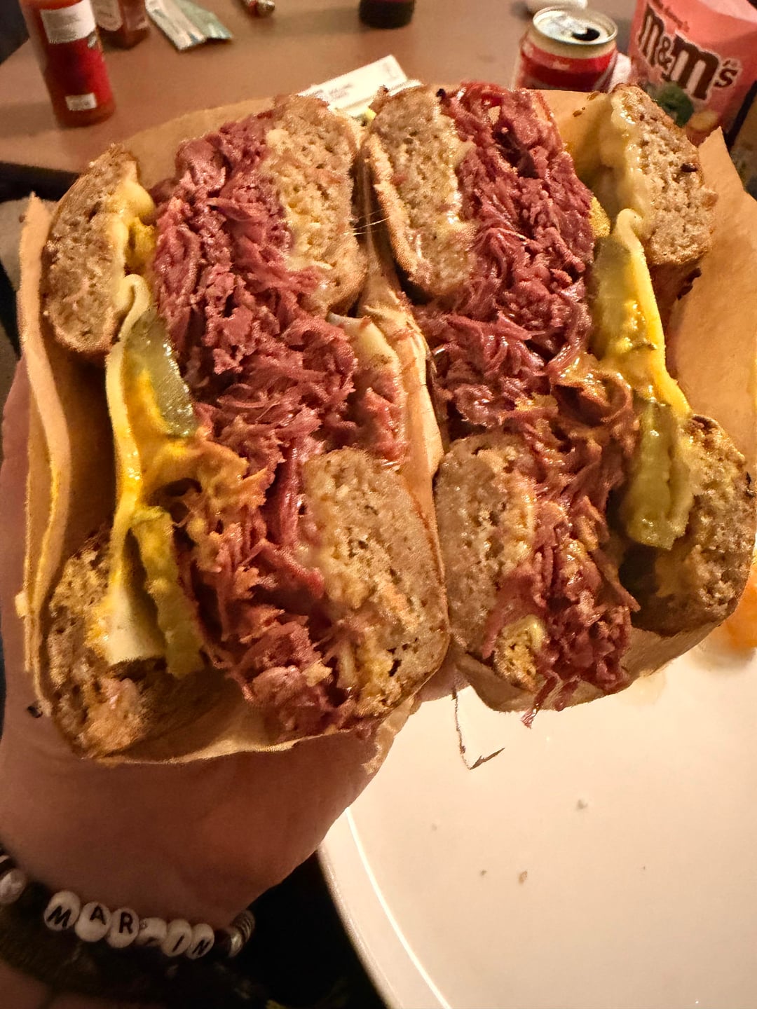[homemade] 50/50 white and Rye bagels with everything seasoning. With salt beef, pickles, mustard and cheese.
