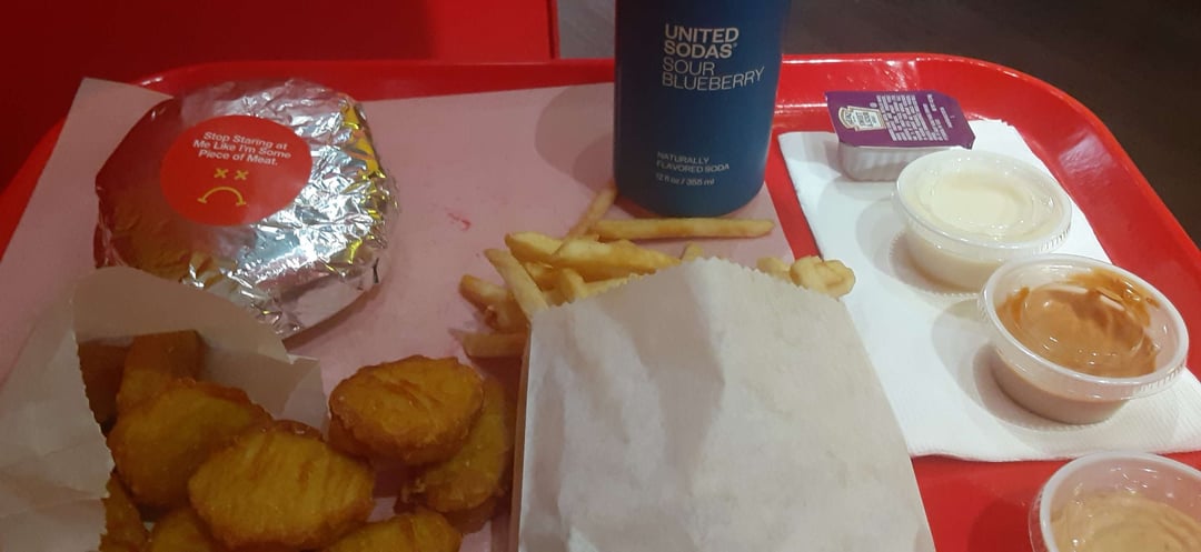Basically a vegan McDonald's and is right across the street from one. I got the Mr. Royale with Cheese Frowny Meal and chicken nuggets. Great to see how busy it was. I was lucky to get a seat! by verdantsf Vegetarian