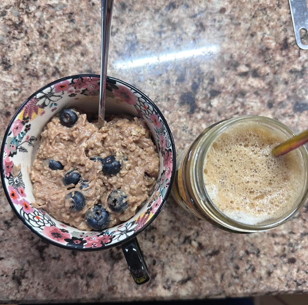 1st pic: ice coffee latte (was absolutely disgusting) along with oatmeal w/ almond milk, blueberries, figs, & protein powder
