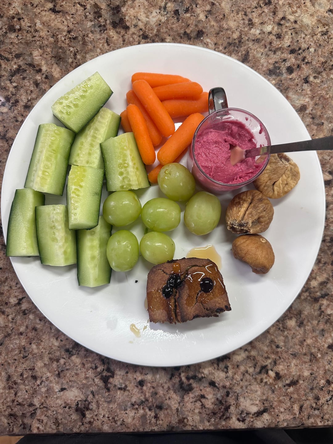 2nd pic: cucumbers, carrots, hummus, grapes, figs, & homemade banana bread w/ drizz of honey