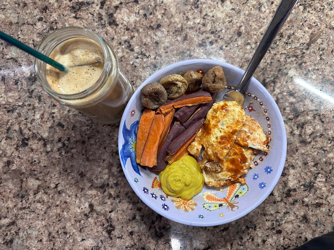 1st pic: eggs, sweet potatoes, mustard, figs, & iced coffee