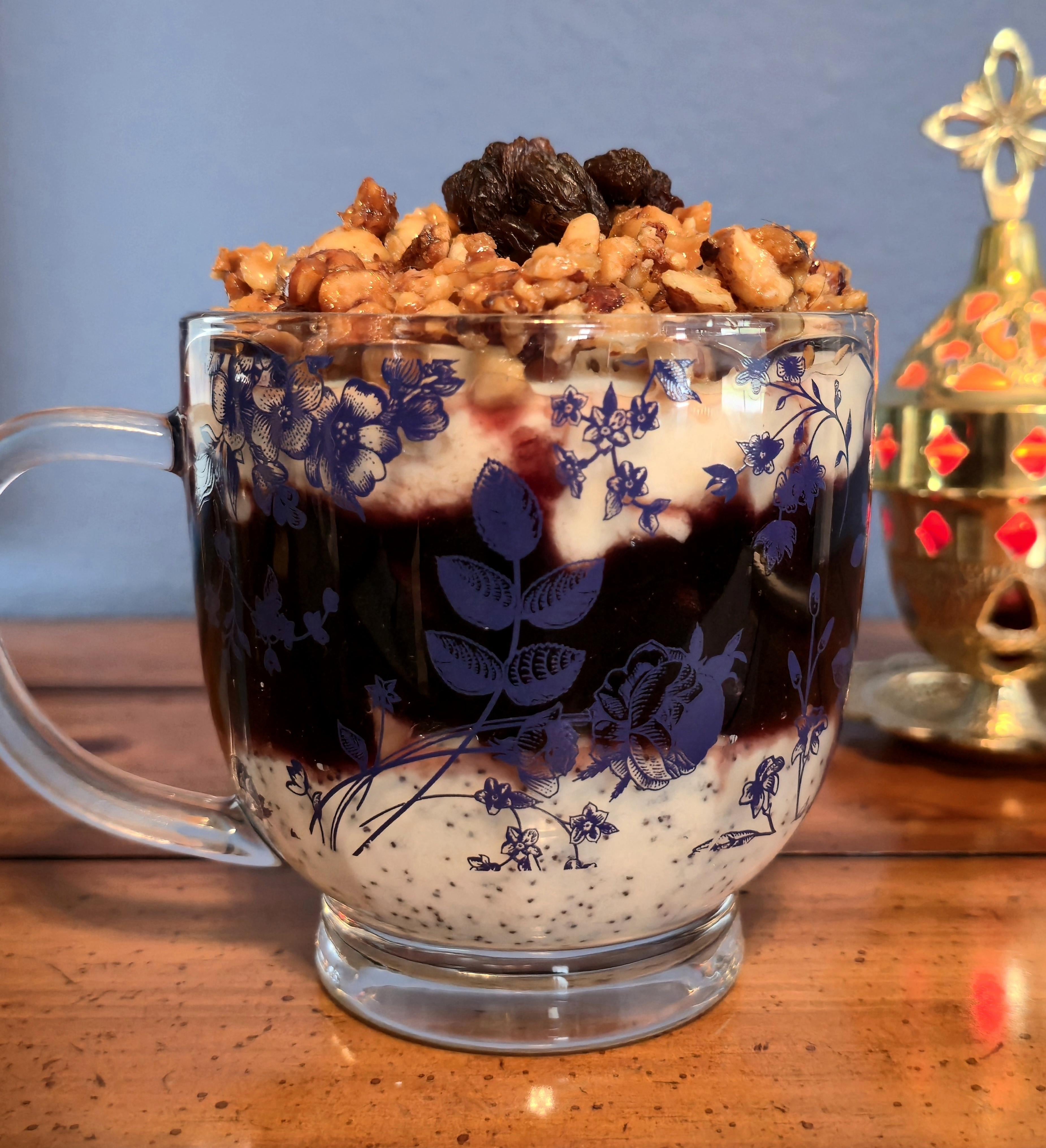 I made Russian Guryev porridge which includes a layer of semolina porridge with poppy seeds, blackberry jam with raisins, semolina porridge, roasted hazelnuts and honey, and topped with more raisins.