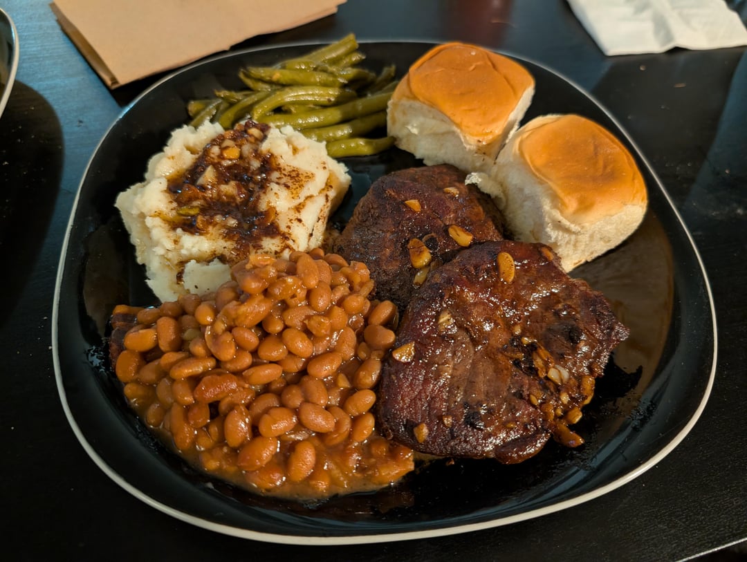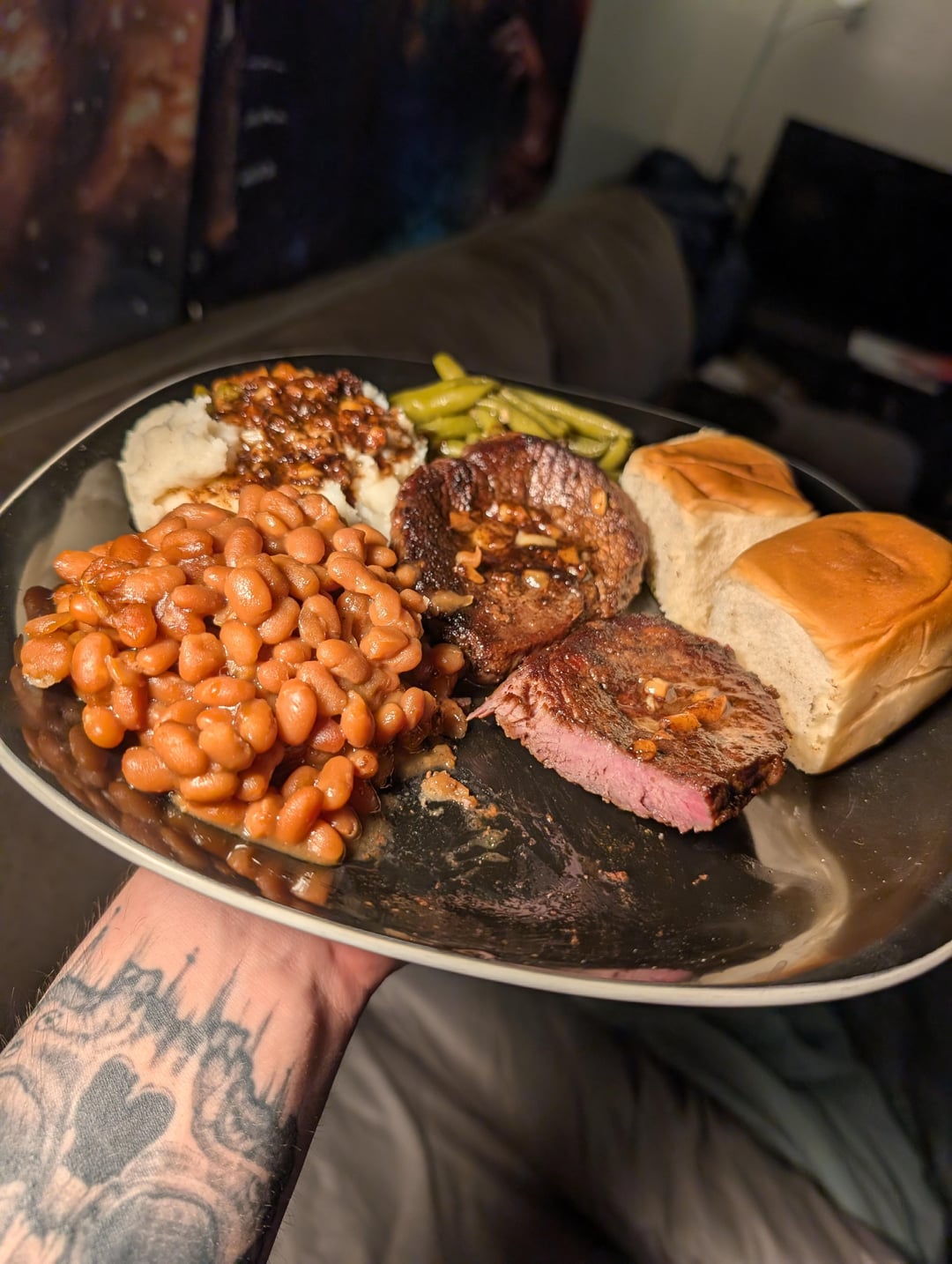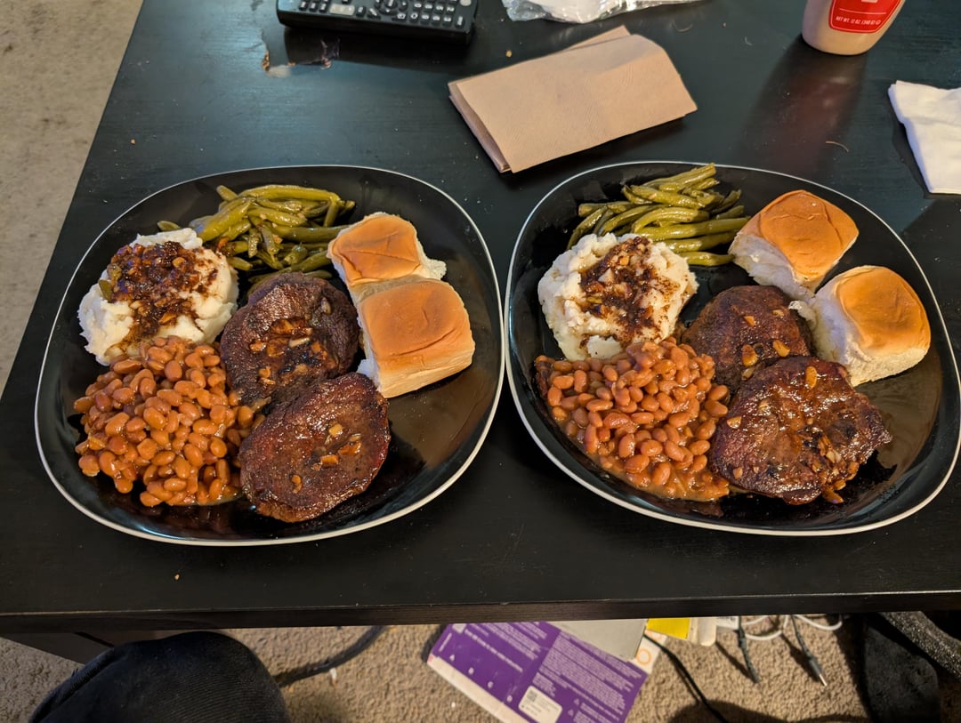 Chuck tender steak, mashed potatoes, green beans, baked beans, and Hawaiian rolls by cohonka Dinner Tonight Tonight's Dinner