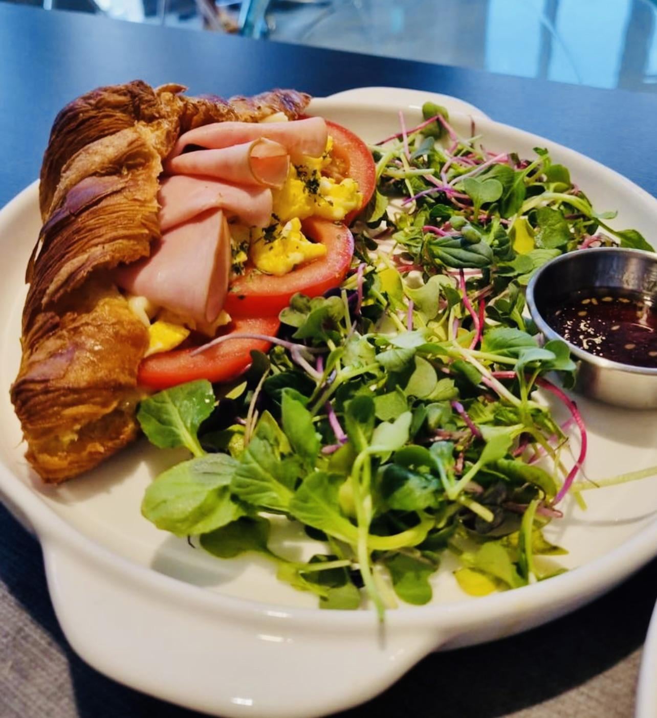 My friend put together this brunch for me. Croissant sandwich with egg, ham, and tomato with a fresh salad on the side. by Global_Glass_4875 Food