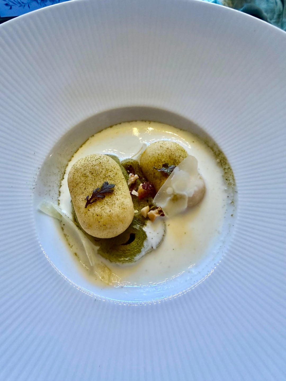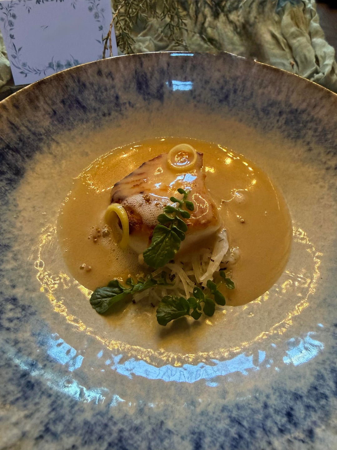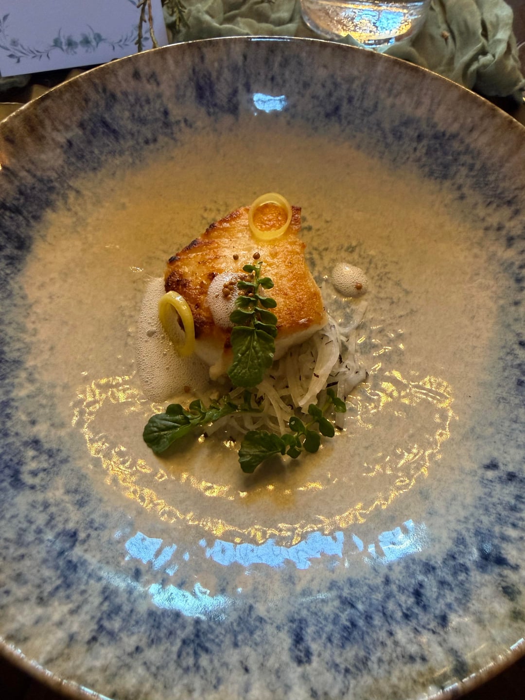 We had a terrific time on a lovely early spring evening. The first course shown here was a lovely little goat cheese and veg amuse not listed on the menu. There was also a bread service (not pictured) and a sorrel granita course not listed on the menu.