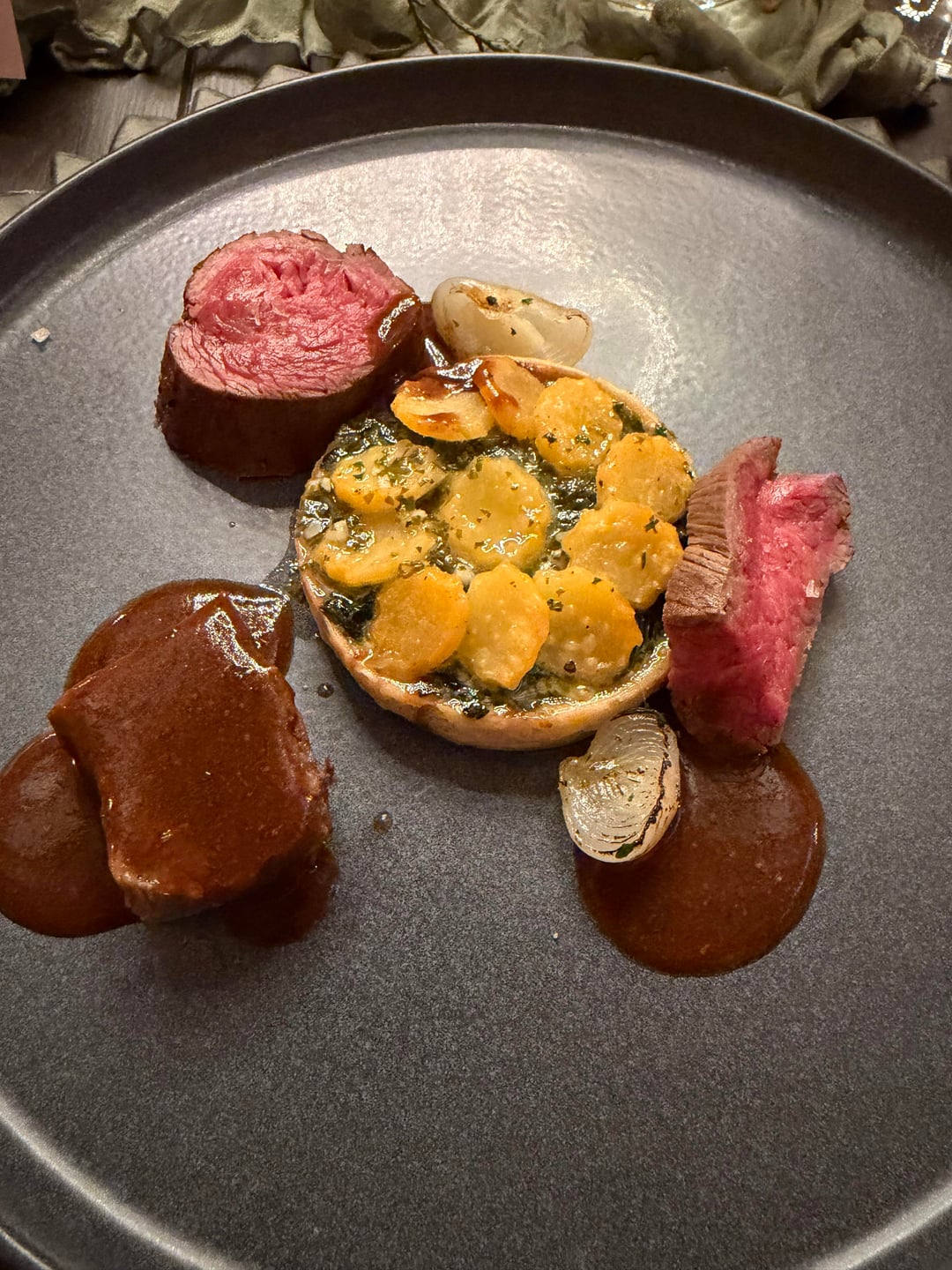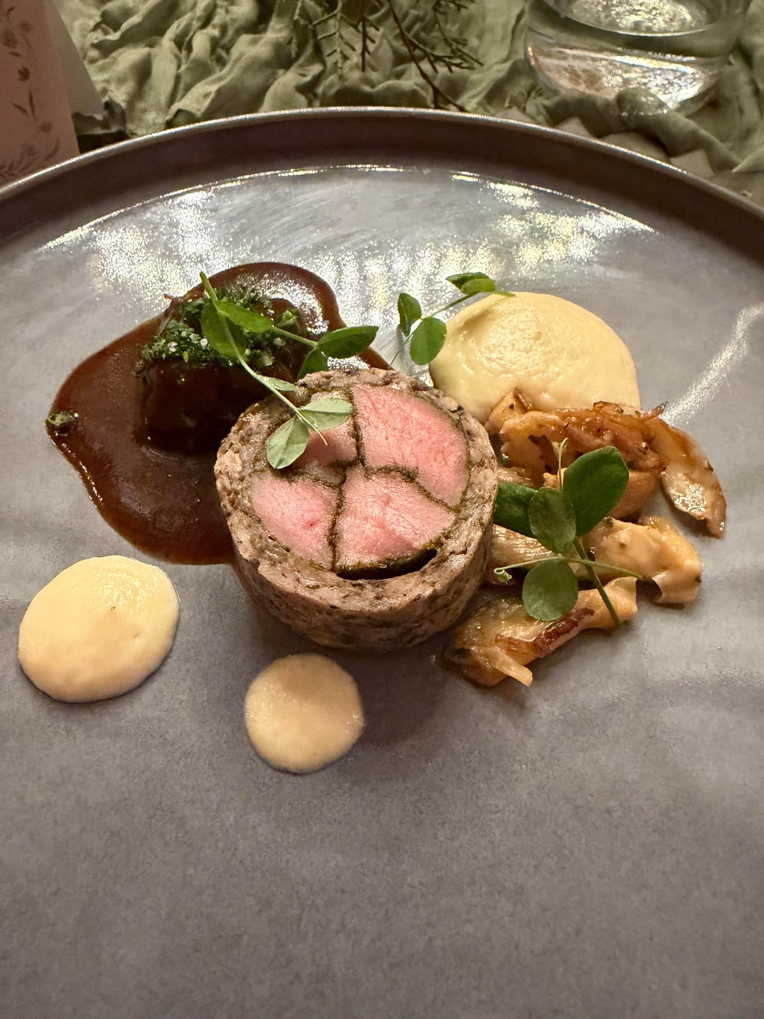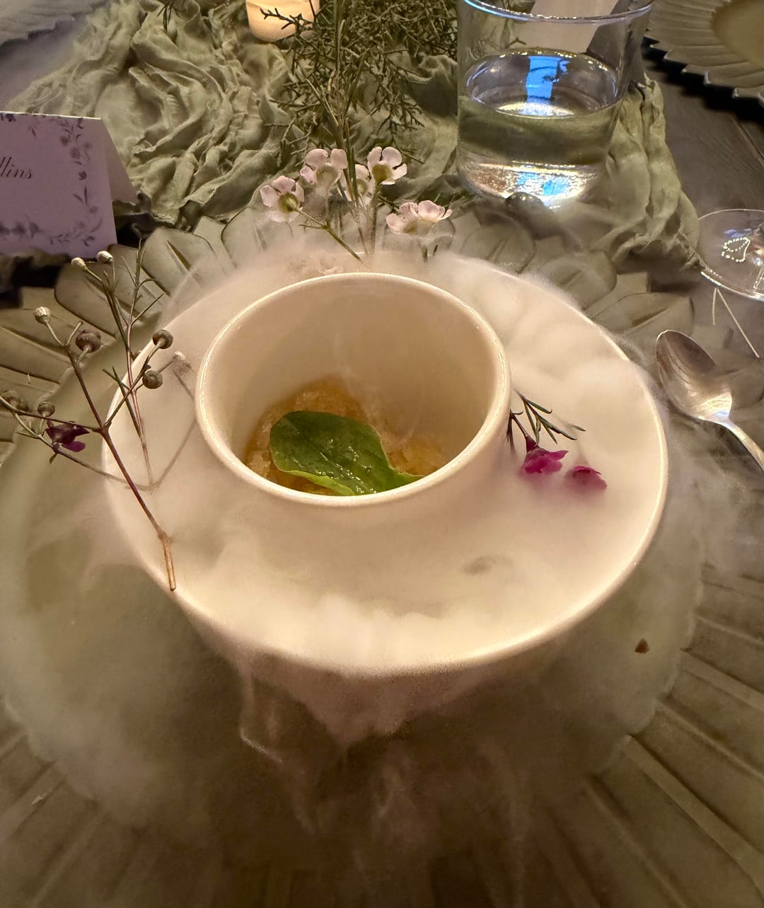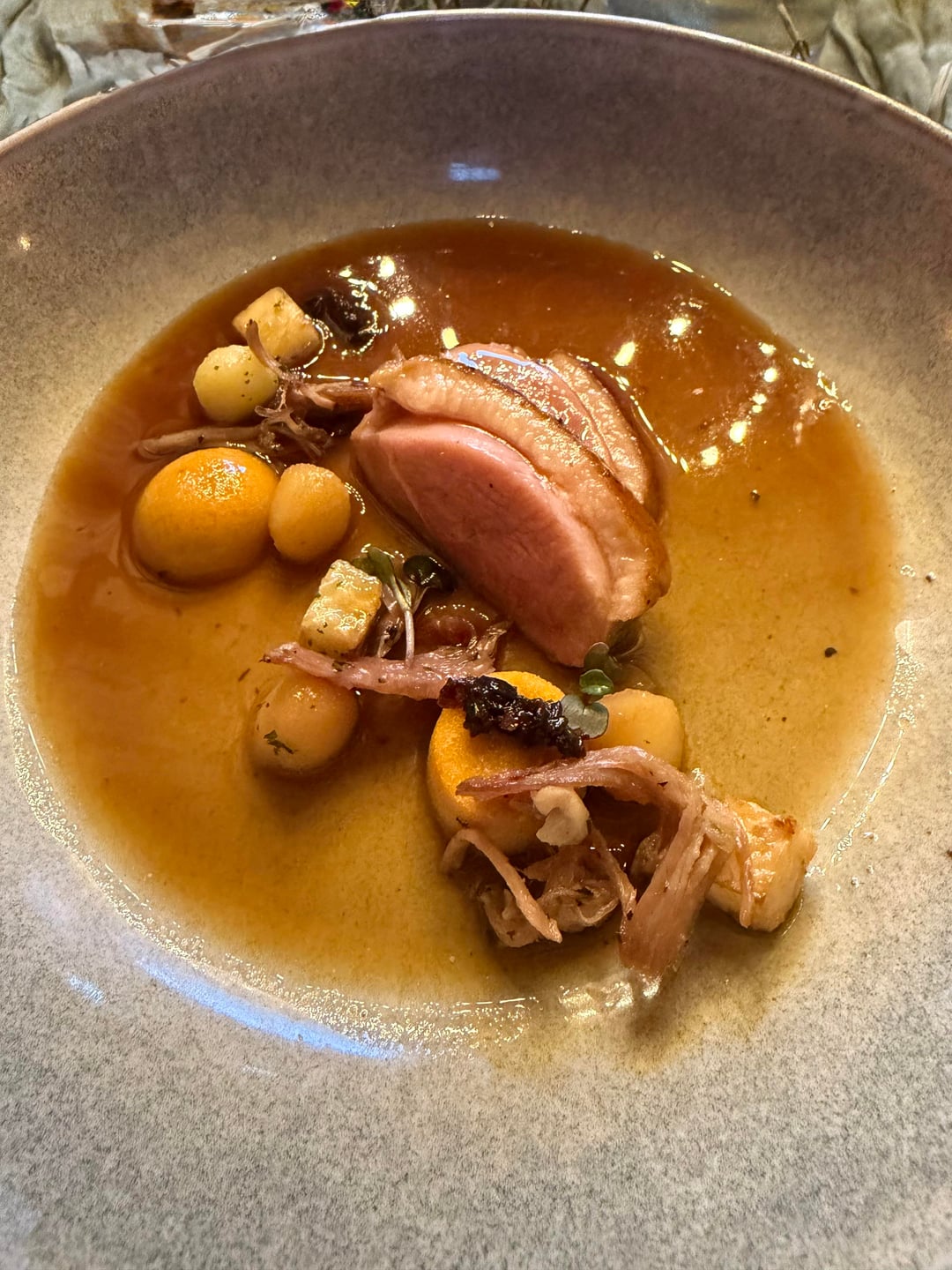 We had a terrific time on a lovely early spring evening. The first course shown here was a lovely little goat cheese and veg amuse not listed on the menu. There was also a bread service (not pictured) and a sorrel granita course not listed on the menu.