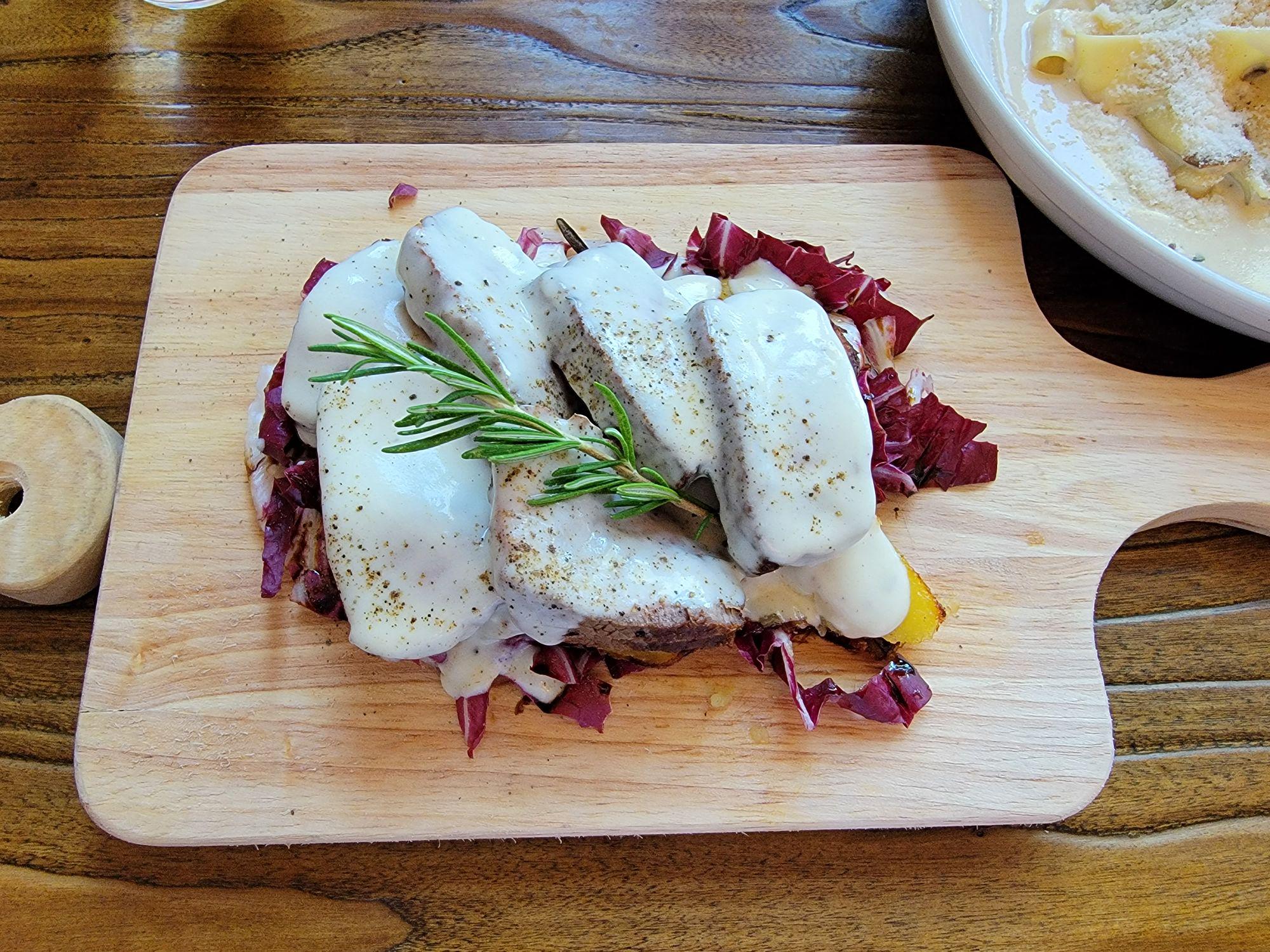 Steak covered in white sauce layed on a bed of red cabbage