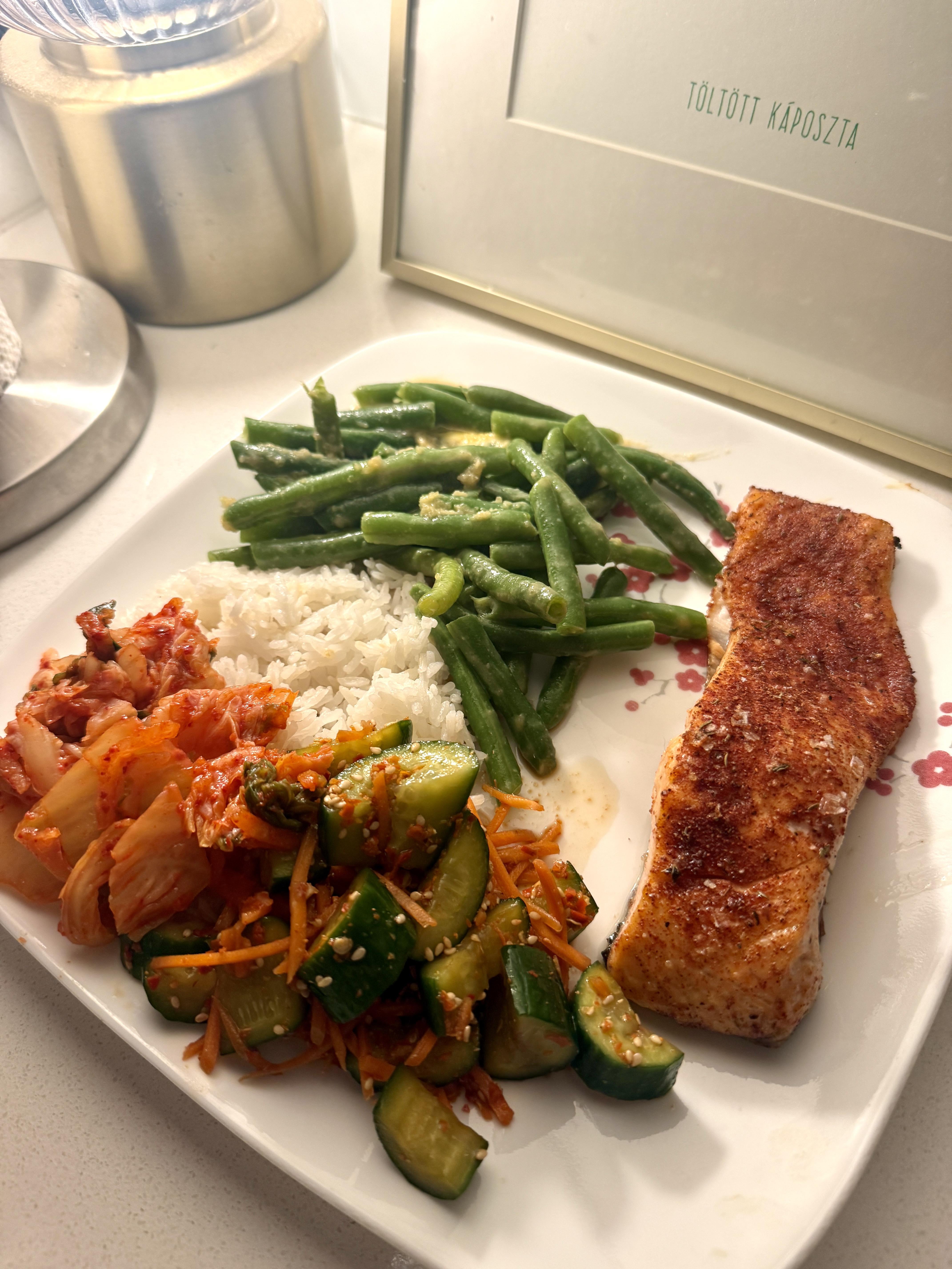 Salmon with miso garlic butter green beans, rice, kimchi, and cucumber banchan by twotwotwototoulouse Dinner Tonight Tonight's Dinner