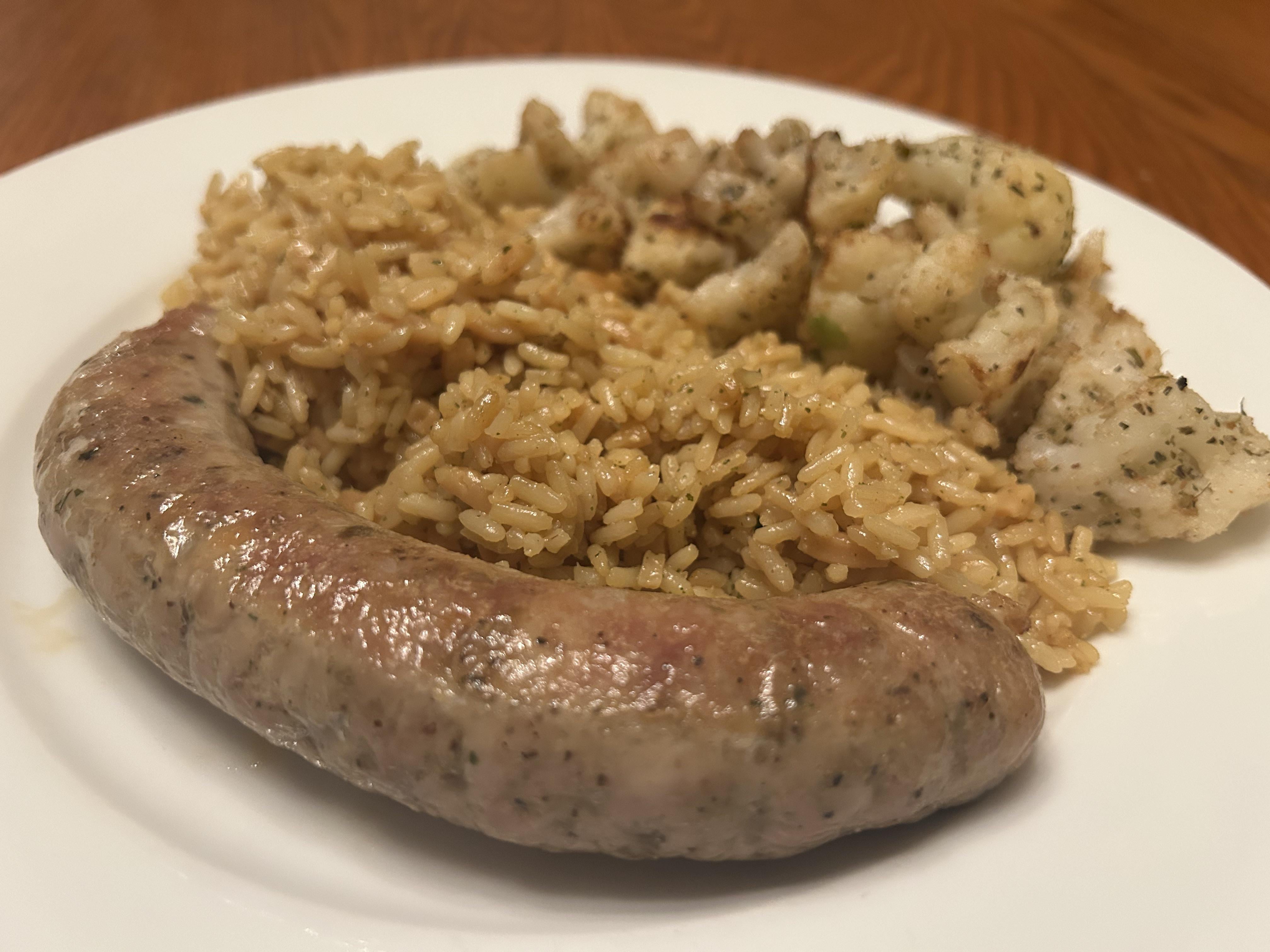 Accidental monochrome [chicken sausage], pilaf, cauliflower by ThorvaldKM Dinner Tonight Tonight's Dinner