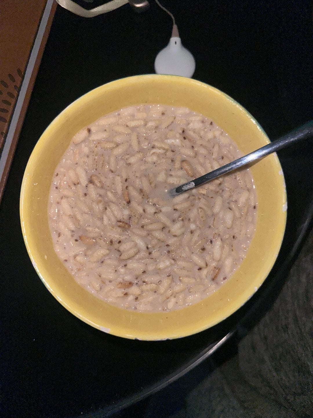 -dinner (264 cals): puffed rice cereal, protein shake (as base for cereal), & chocolate chips (i had to eat this in the dark while watching a movie to distract me from the fact it looked like a bowl of maggots š¤¢)