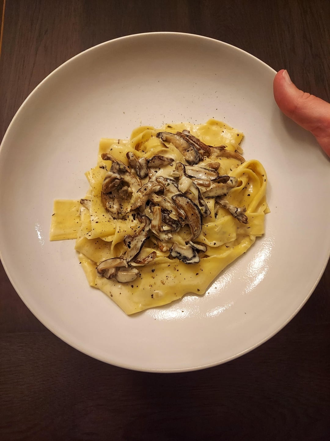 Healthy_Operation327 on March 10, 2026 9:12 pm Recipe: https://www.theoriginaldish.com/2024/02/21/creamy-mushroom-pappardelle/ Round #1 was homemade ravioli last week, which I banned myself from ever making again after spending 3 hours in the kitchen. Figured I’d try again with homemade pappardelle, assuming it would be much less laborious. Spoiler: it was not. Definitely reserving homemade pasta for only special occasions from here on out. Don’t fall for the instagram reels that make it look effortless!