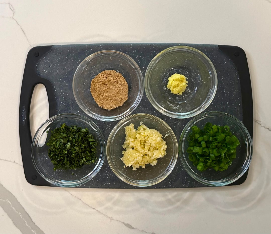Sauce has hoisin, honey, soy sauce, garlic, ginger, pineapple chunks, and chili flakes.