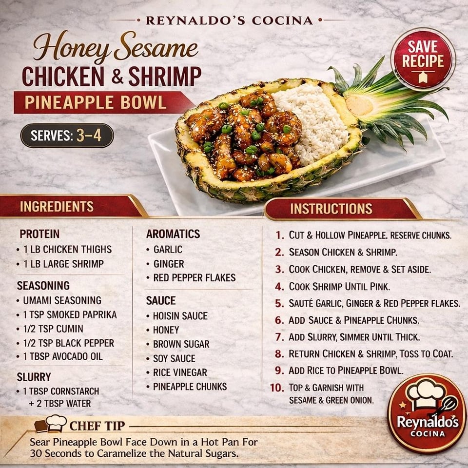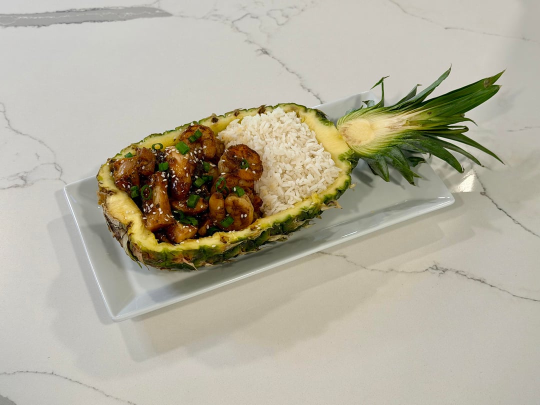Honey sesame chicken thighs and shrimp served in a fresh pineapple bowl with jasmine rice.