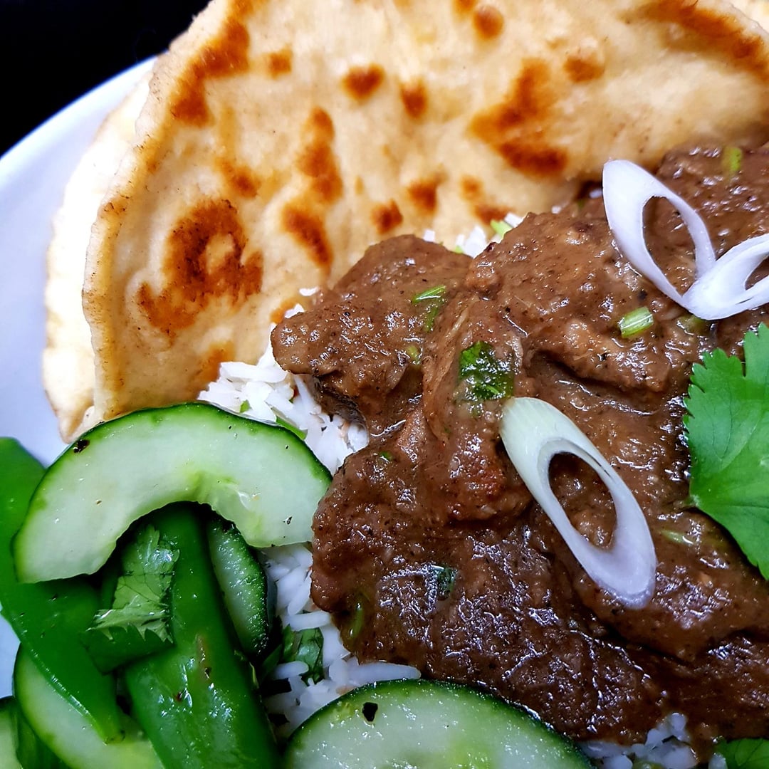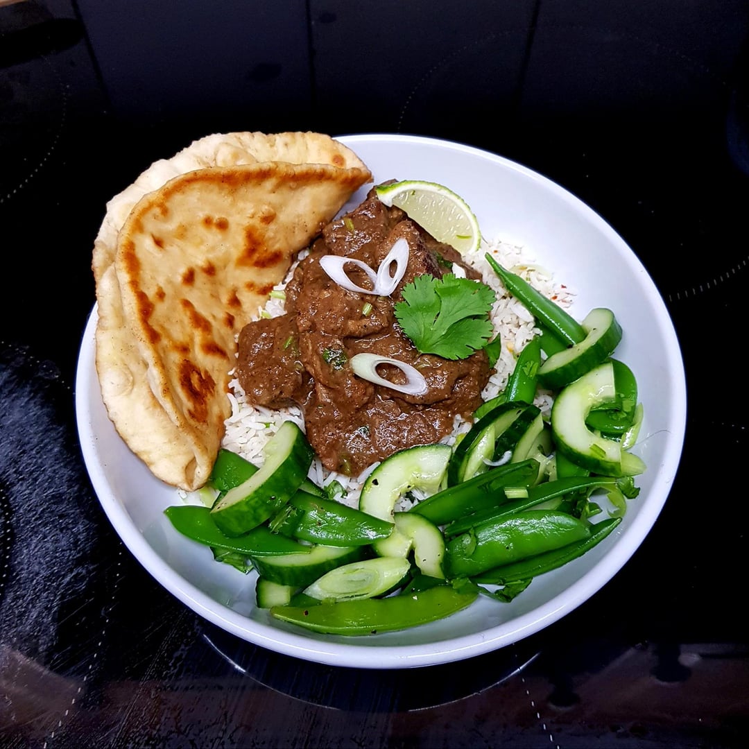 From Scratch Rendang (Usually a Dry Curry) with Extra Sauce, Toasted Coconut Rice, Quick Pickled Cucumber Snap Pea Salad and Roti. by pink_flamingo2003 Dinner Tonight Tonight's Dinner