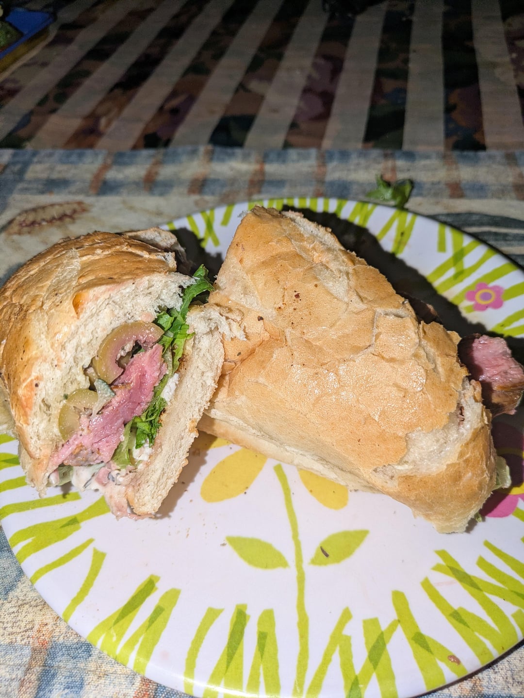 Dinner: steak sandwich ( a little feta, arugula, light tzatziki, olives, cucumber, flank steak, bread-260) – 590