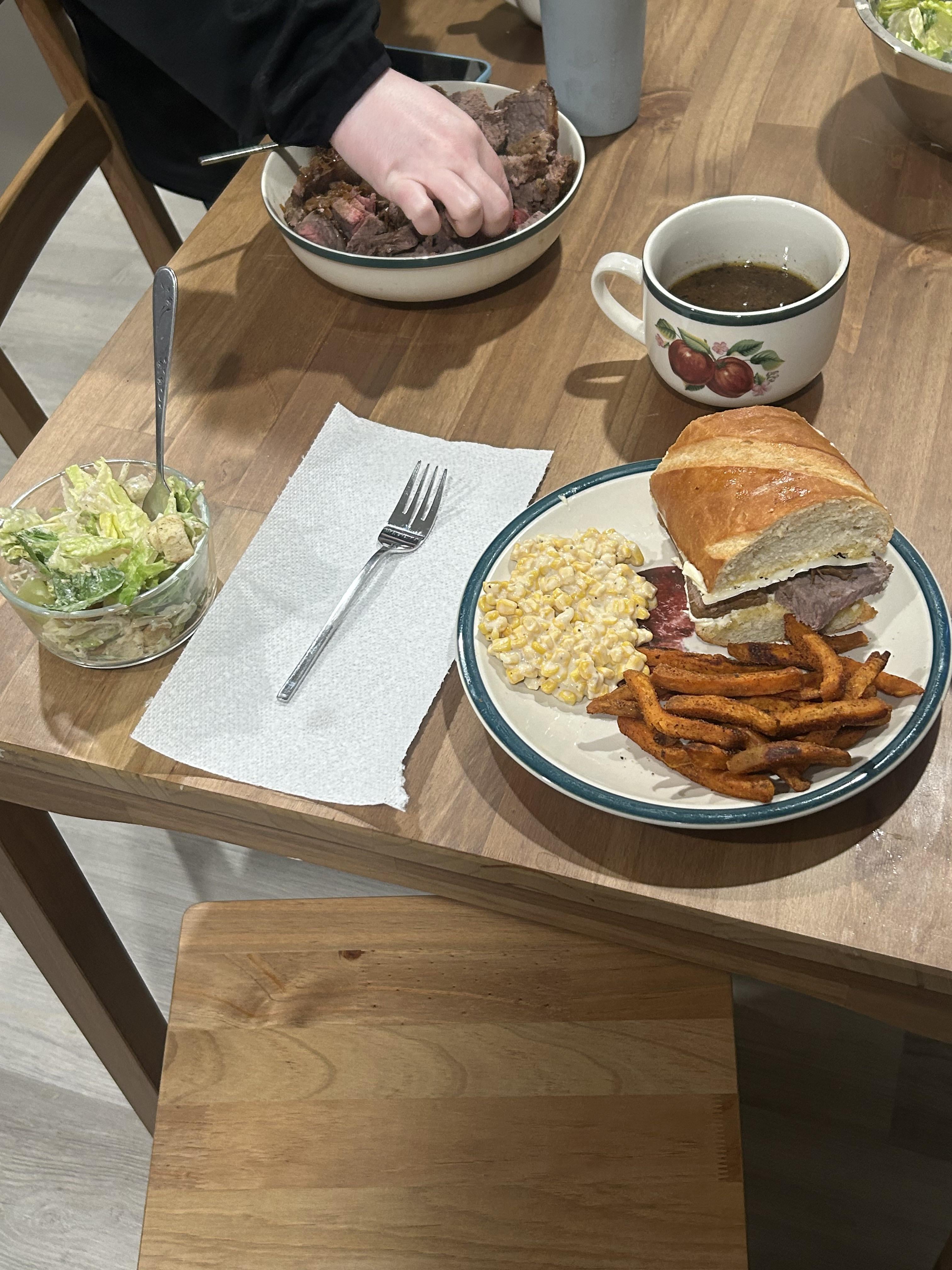 French Dip’s w/ sweet potato fries, creamed corn and ceasar salad! by Exotic-Brilliant-939 Dinner Tonight Tonight's Dinner
