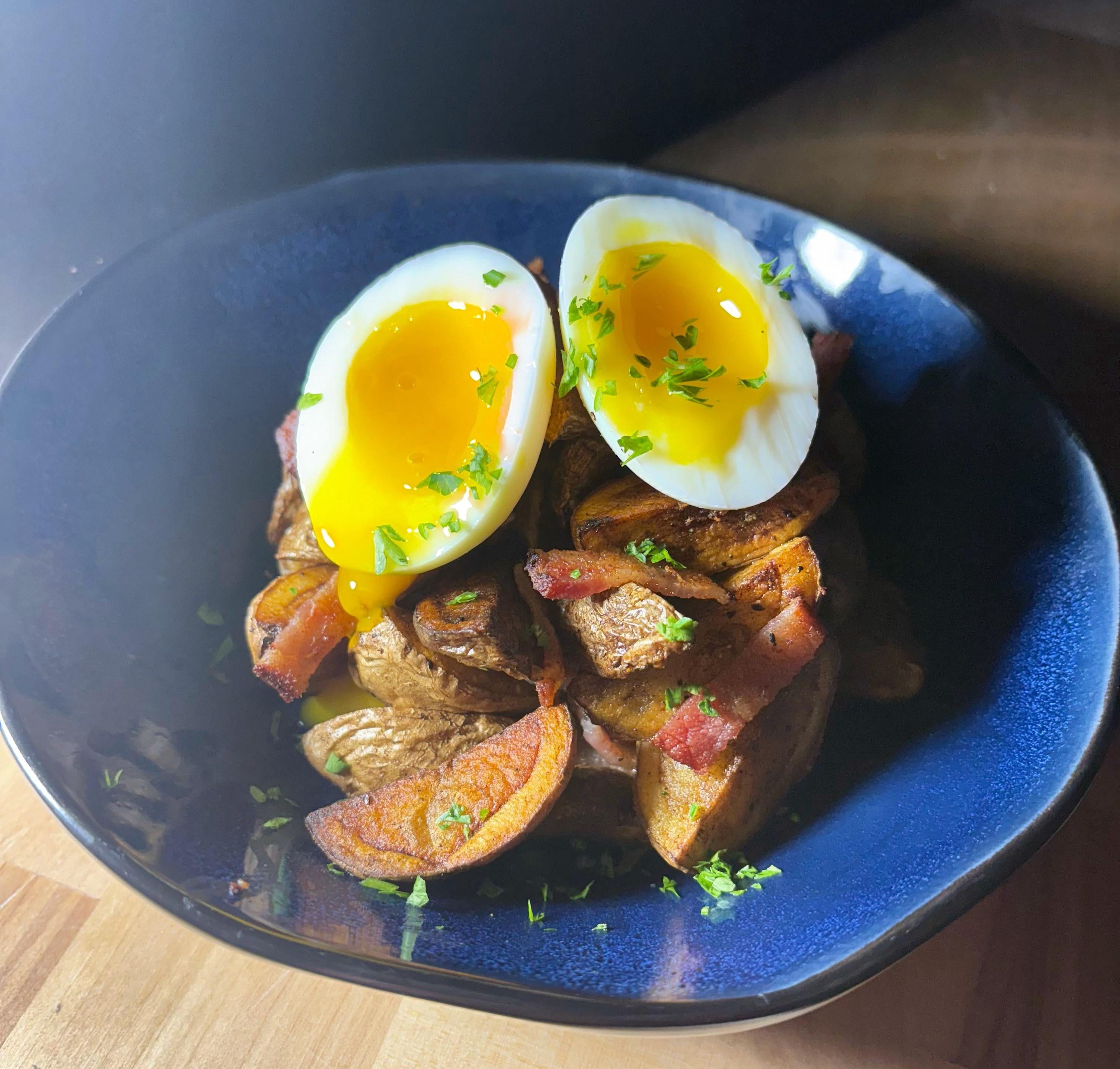 [Homemade] Crispy potato bacon hash topped with a jammy 6½ minute egg