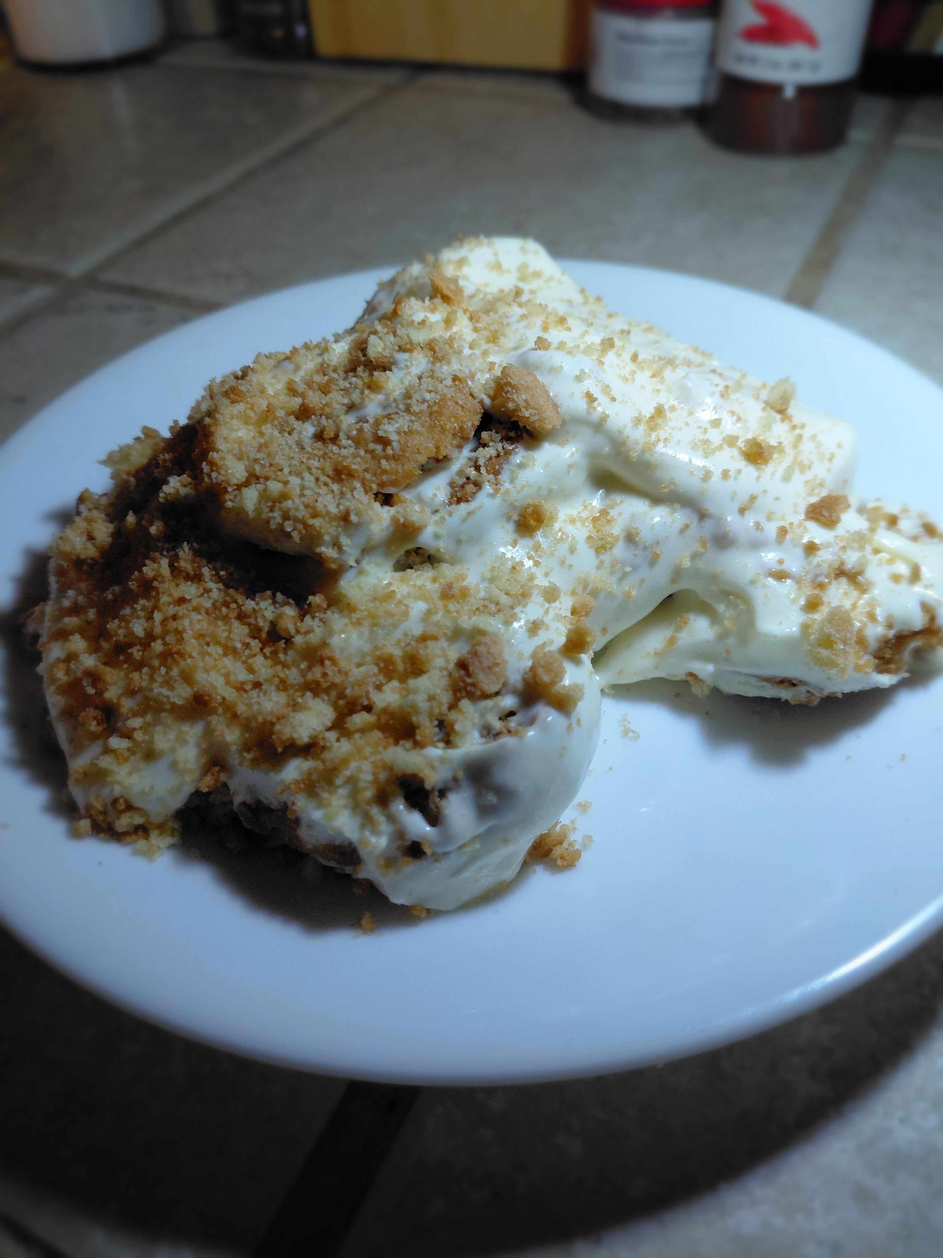 This is a little thing i threw together trying to be crafty. A 3.4 ounce box of jello instant lemon pudding and one 3.4 ounce box of the cheesecake pudding, 4 cups of milk, 16 ounces of whip cream, 1 can of condensed milk, 2.5 teaspoon vanilla extract, 2 tablespoons fresh lemon juice, 3 teaspoons honey, 16 ounces of cream cheese and graham cracker. Yall, its fantastic. Will probably make another one as soon as this one’s gone haha