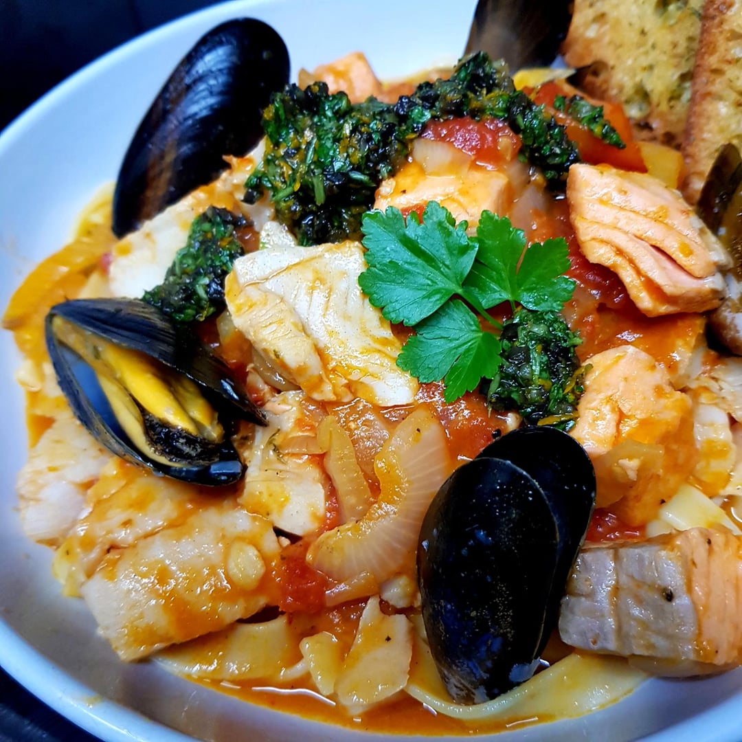 Mediterranean Seafood Stew. Fennel and Tomato Based Sauce w Tagliatelle. Parsey and Orange Gremolata and Sour Dough Garlic Bread.