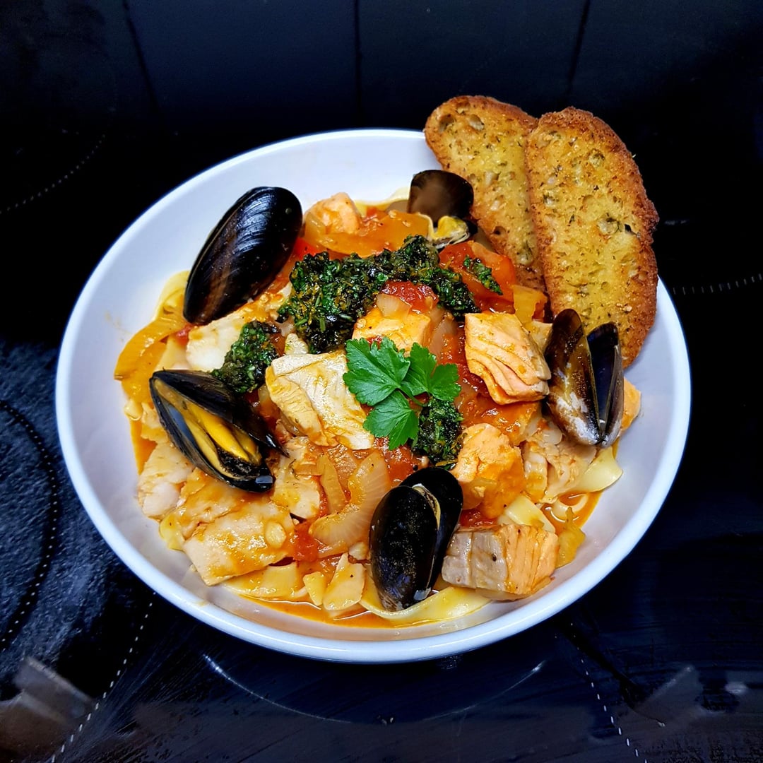 Mediterranean Seafood Stew. Fennel and Tomato Based Sauce w Tagliatelle. Parsey and Orange Gremolata and Sour Dough Garlic Bread. by pink_flamingo2003 Dinner Tonight Tonight's Dinner