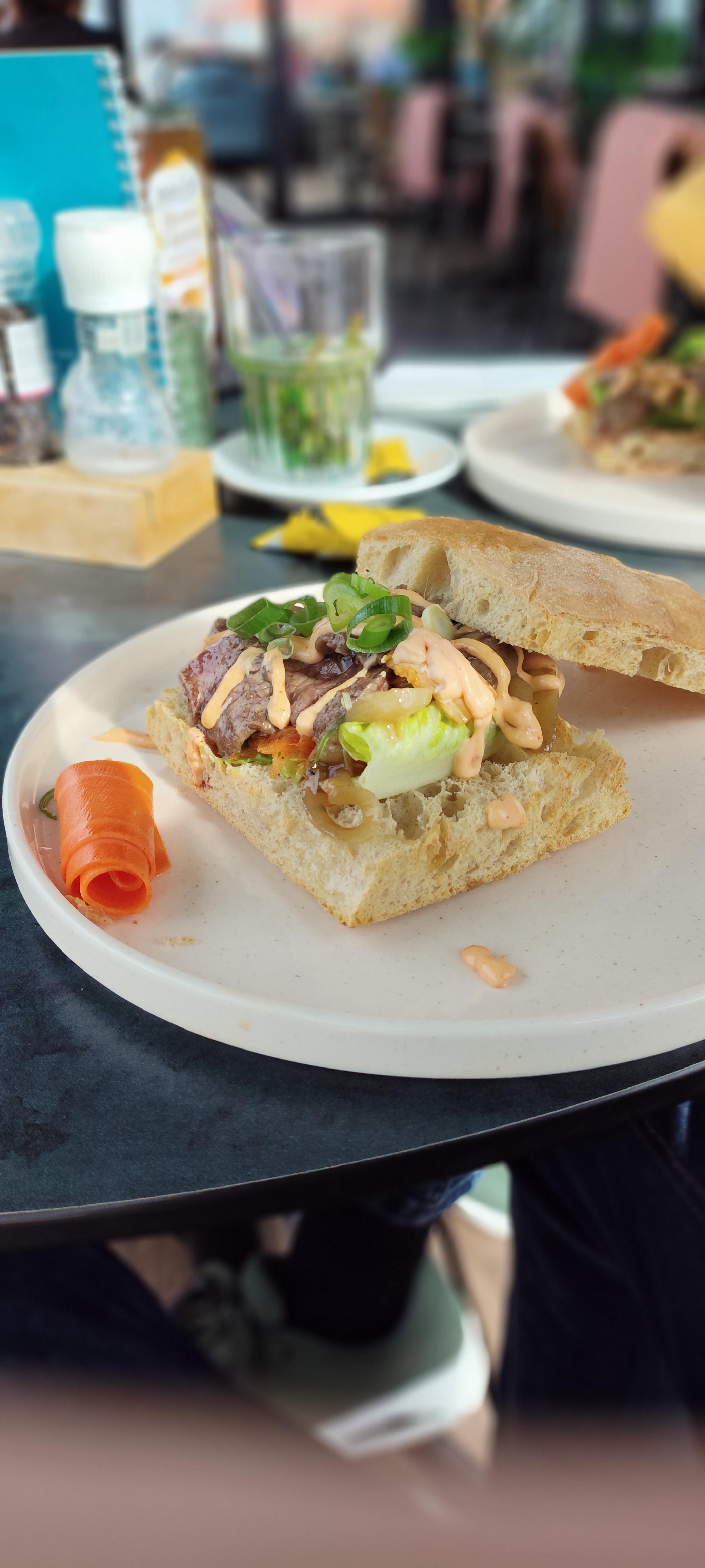 I slapped a chopped bacon, seasoned egg, sharp cheddar, baby spinach, diced tomato, and diced red onion scramble onto half a French baguette and then I doused it with Valentina hot sauce.