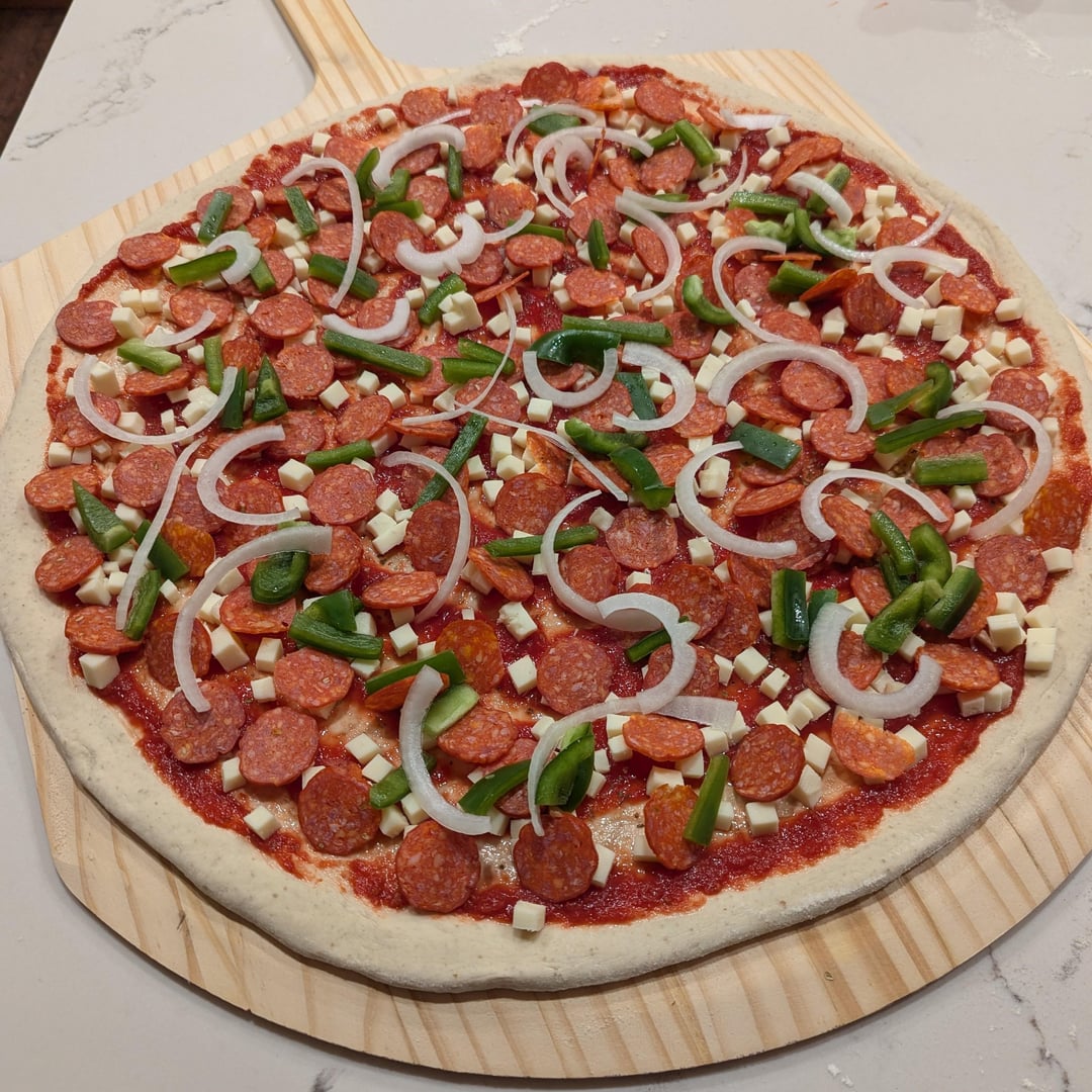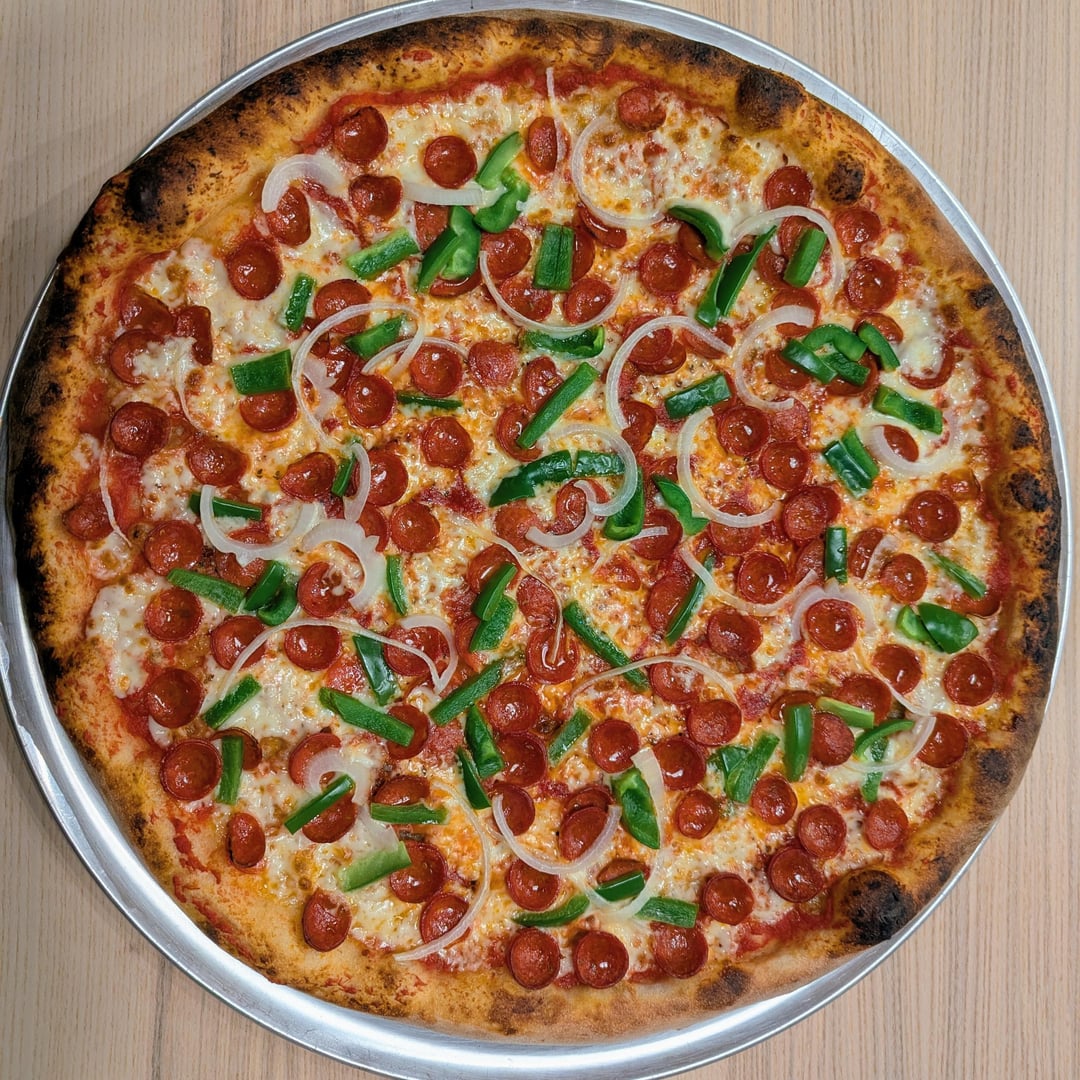20" NY Style pizza for pi day. 62% hydration 72 hour cold ferment with natural casing pepperoni, green pepper and onion. by iheartbicycles Food