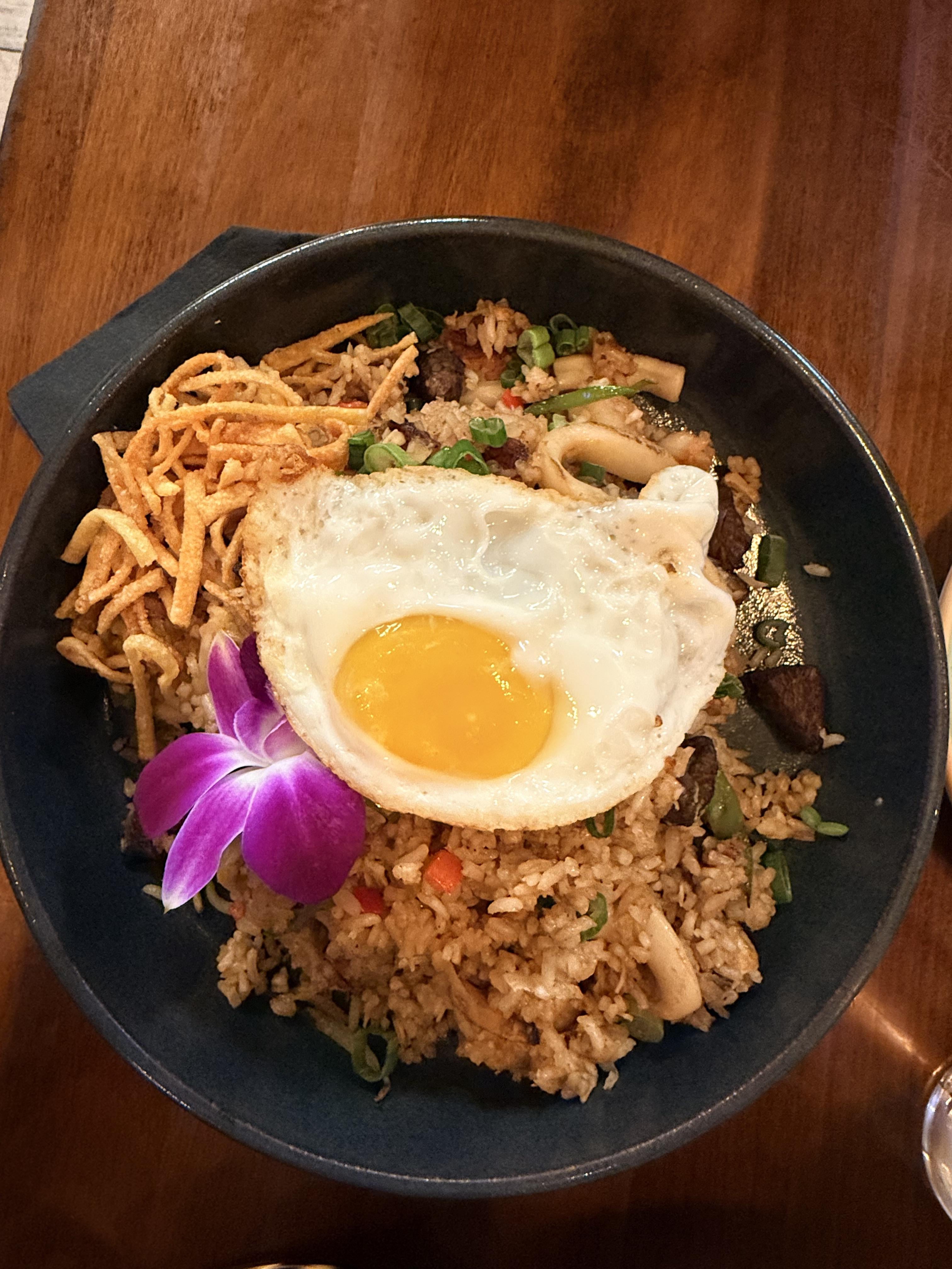 Fried rice with seafood, beef, crispy noodles, and a sunny side egg by Turbulent_Mountain81 Dinner Tonight Tonight's Dinner