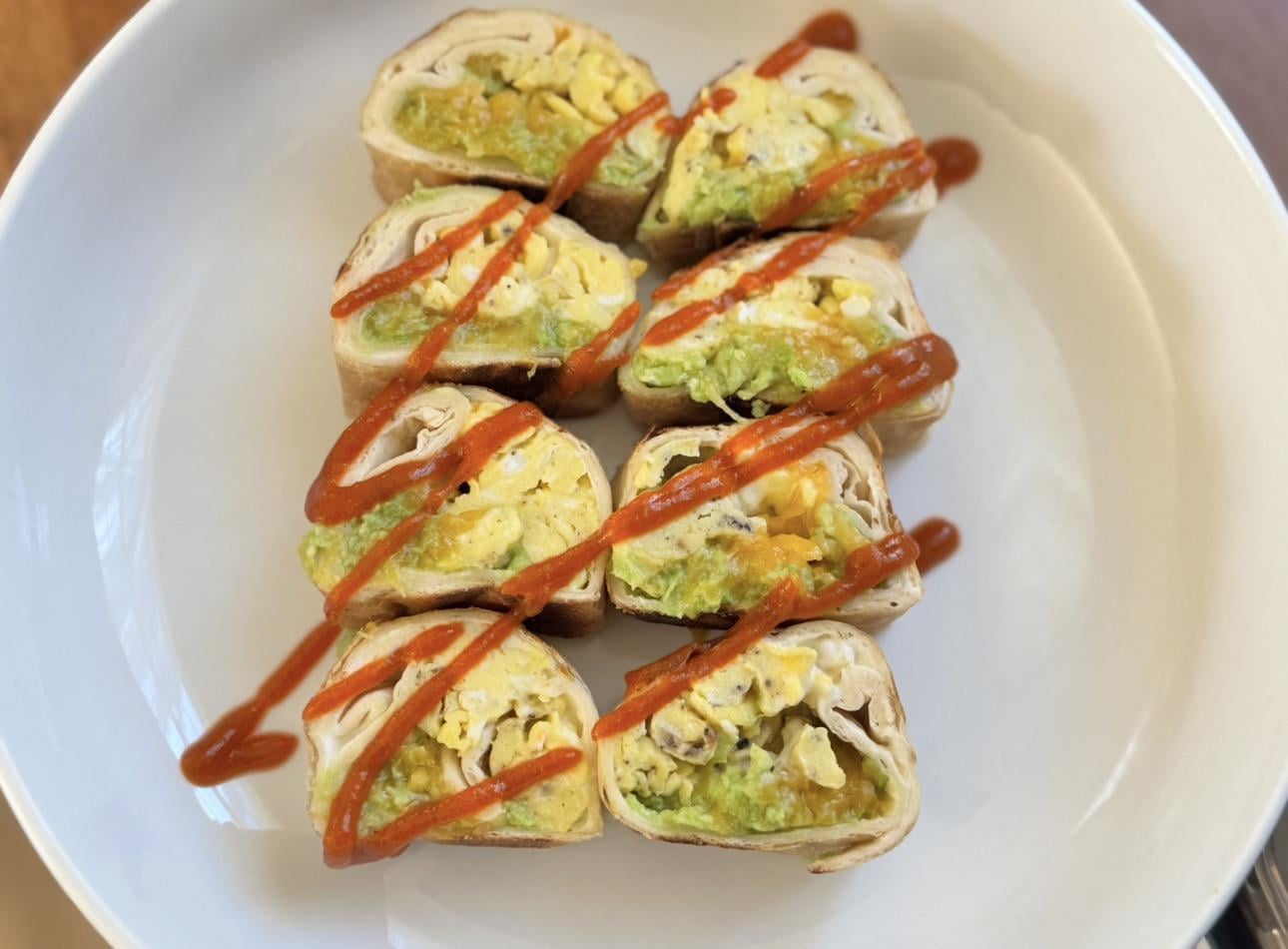 Something I make at home, I affectionately refer to is as "breakfast sushi" – although not sushi whatsoever, just a fun way to liven up breakfast! I usually scramble eggs and then add avocado, cheese, and sometimes turkey (not this time) – then roll it up tight in a tortilla and pan sear each side before slicing and plating with a drizzle of sriracha.