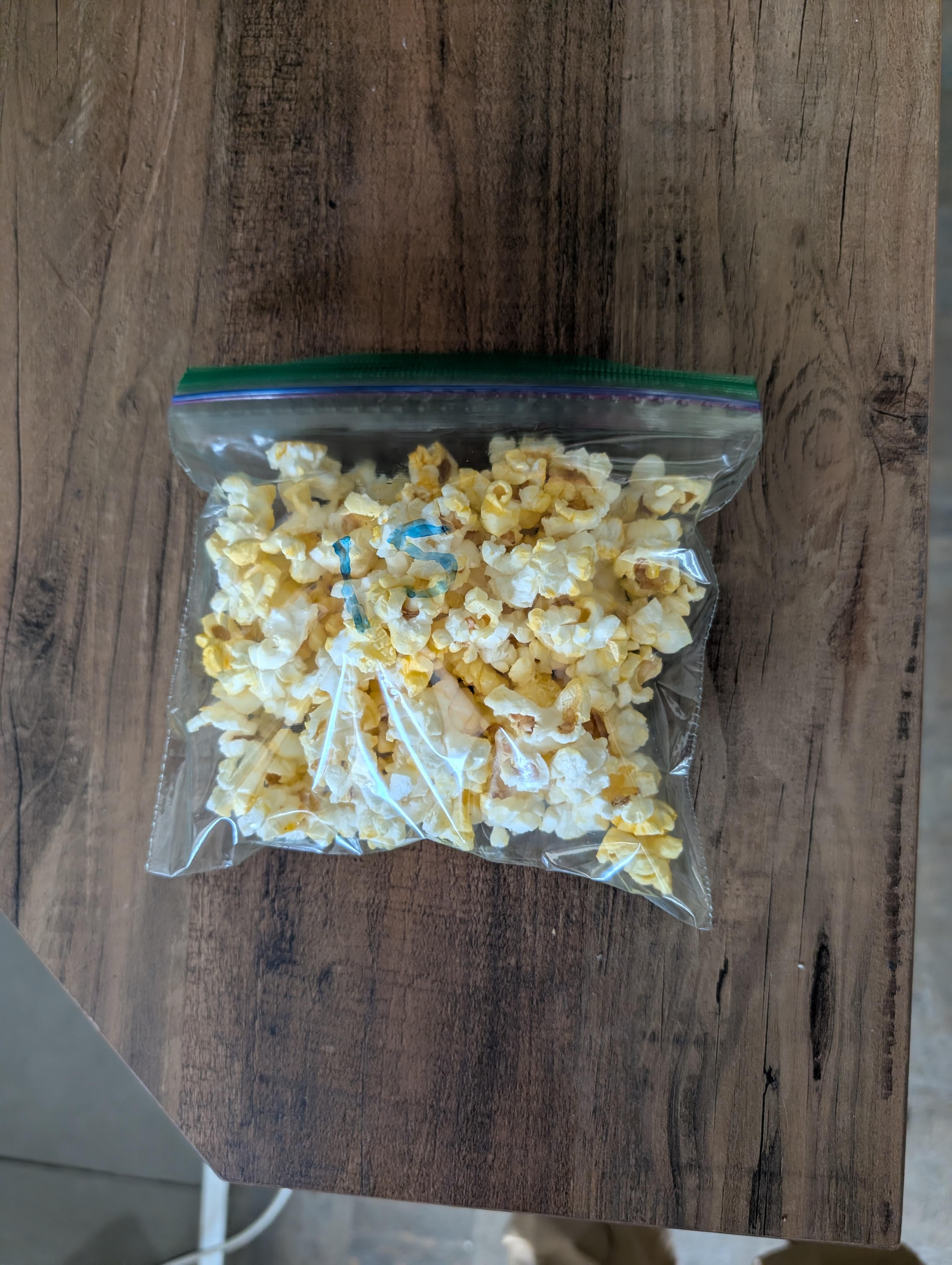 I was feeling snacky so I ate 1 square of dark chocolate and this pre portioned bag of popcorn.