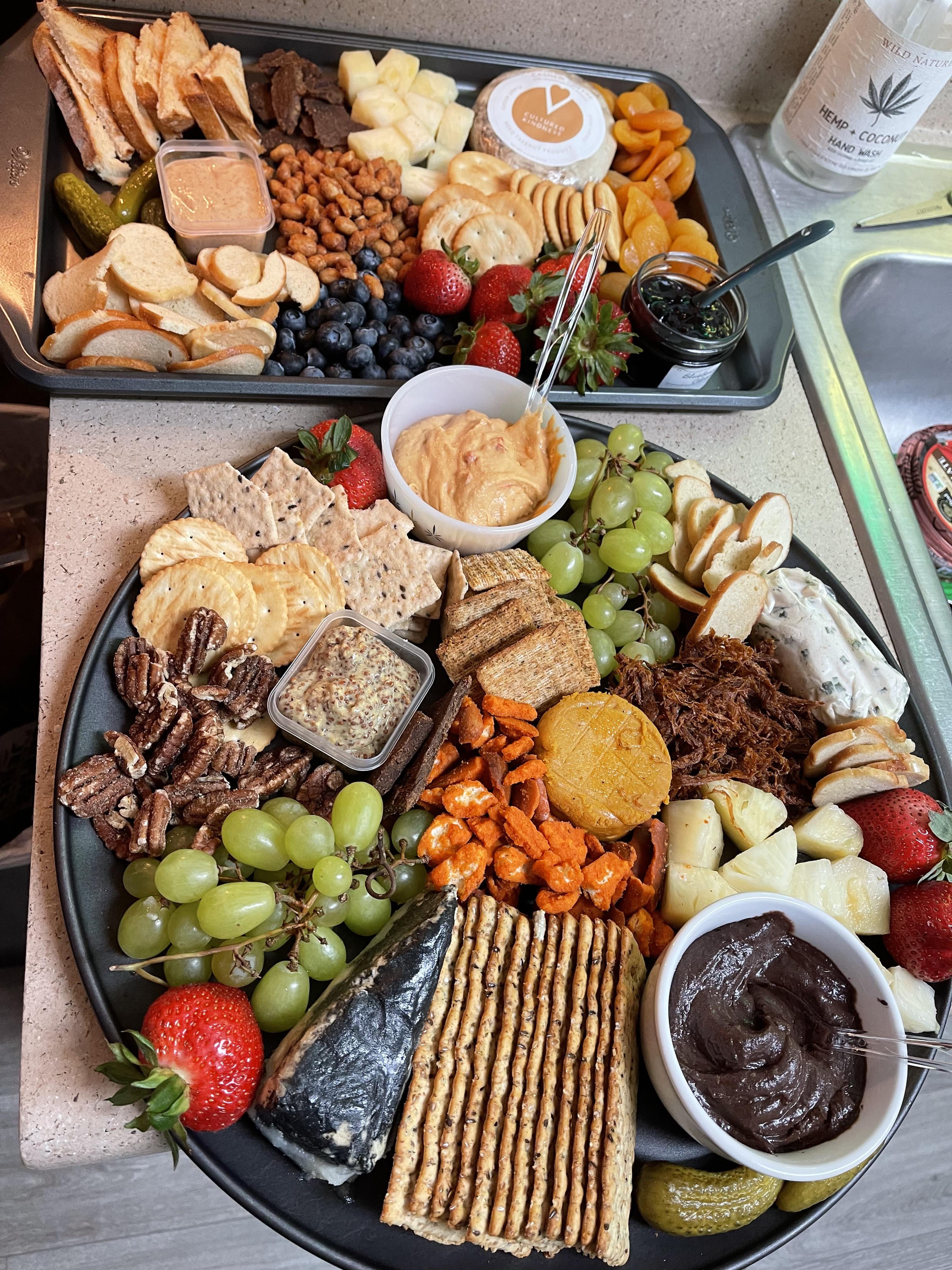 Two completely vegan boards I made a few years ago! (Before I had a nice wooden board) In case anyone was wondering with the advancements in vegan cheeses these are very doable! I even found some vegan “beef jerky” for mine 😂 by championofthesun93 Charcuterie Charcuterie Board