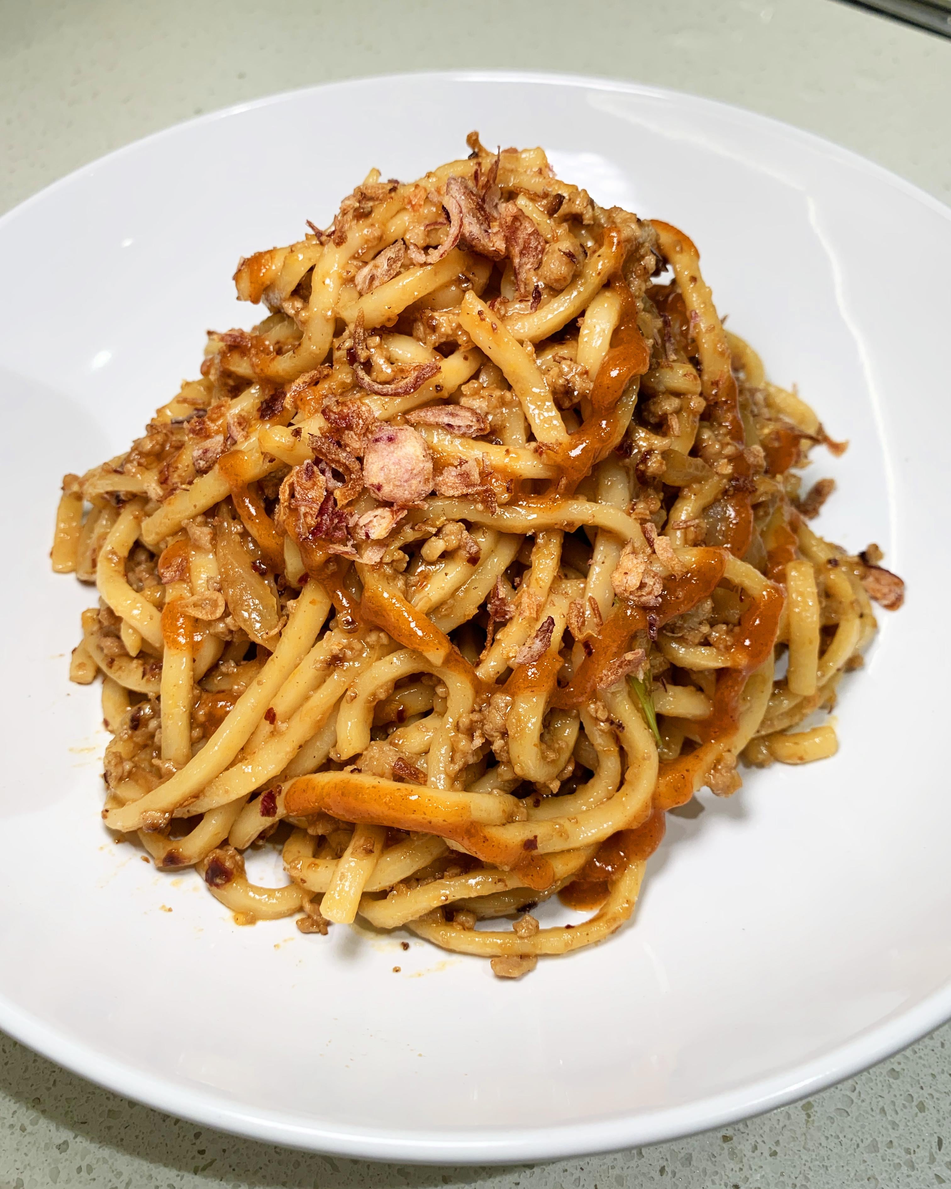 Sweet Chili Soy Pork Mince Noodles with Caramelised Onion and Sriracha Kick