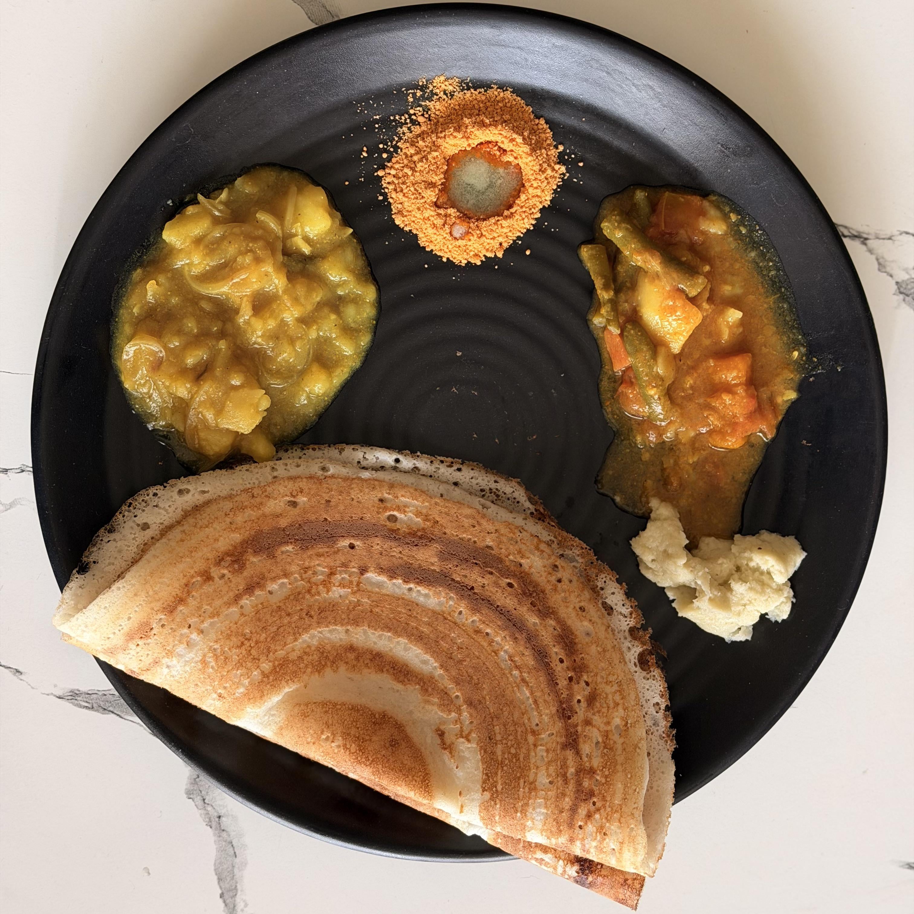 Homemade dosas with aloo masala, sambar, coconut chutney and mulagapodi [OC] by JauntyDepress Food Porn