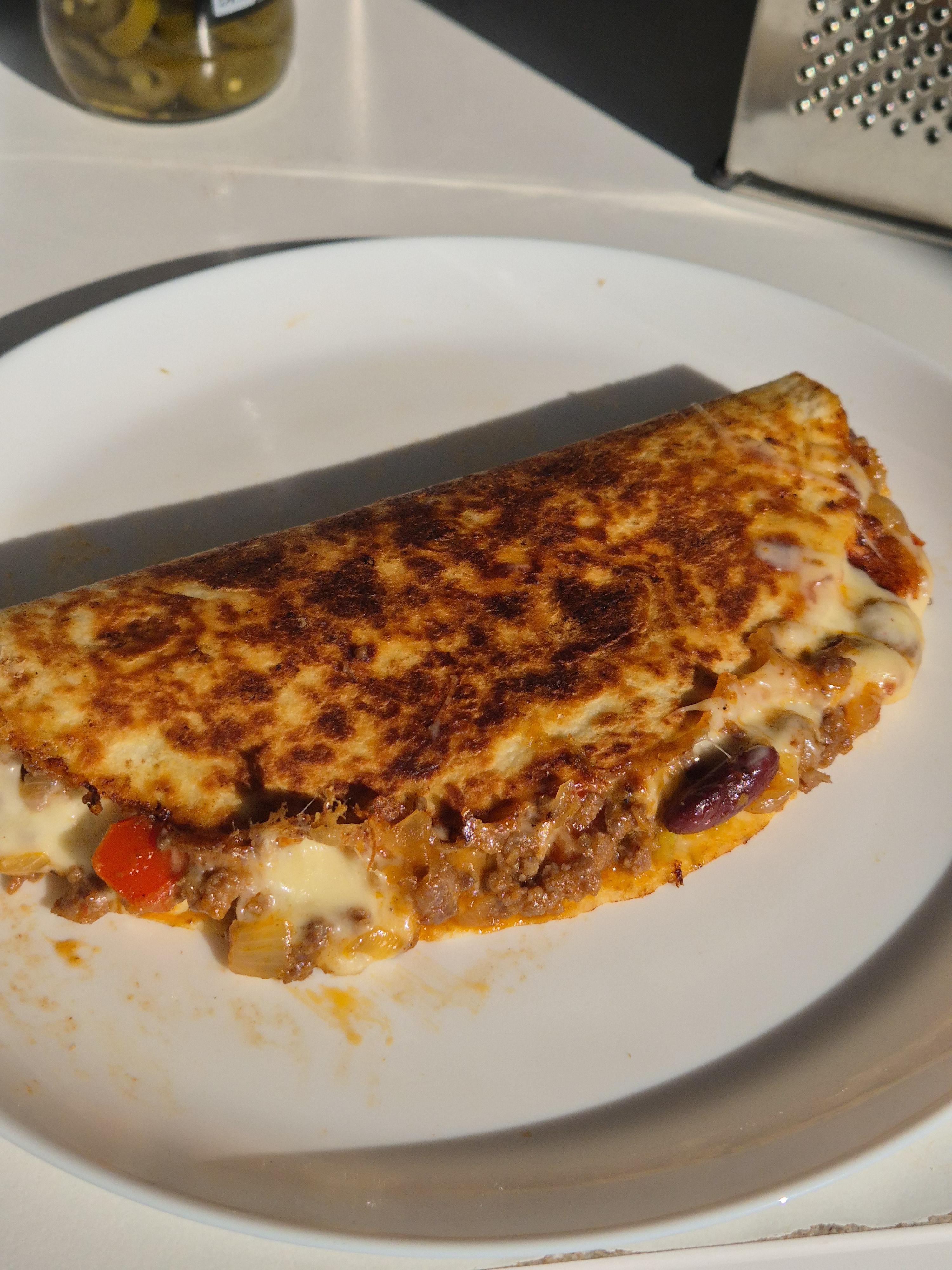 First time making Quesadillas at home: tortilla, onion, pepper, ground beef, black beans, pickled jalapeƱo, cheese, olive oil and some spices š by Outside-Ad-2872 Food Porn