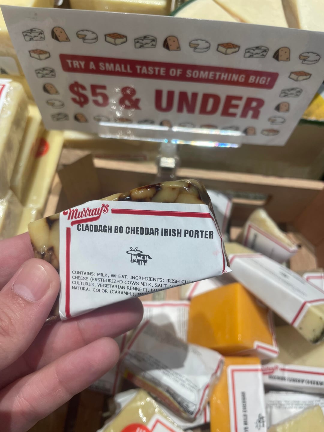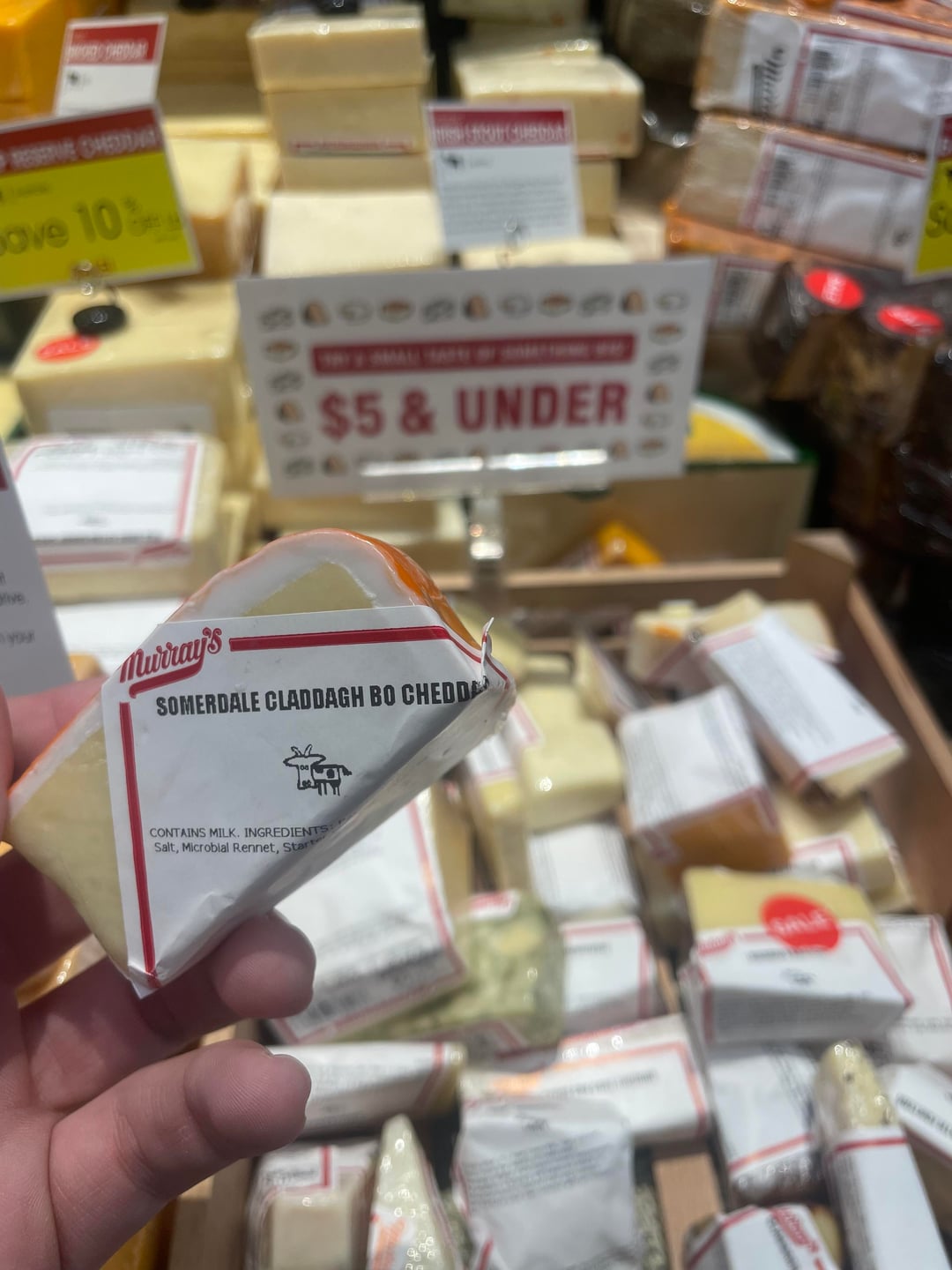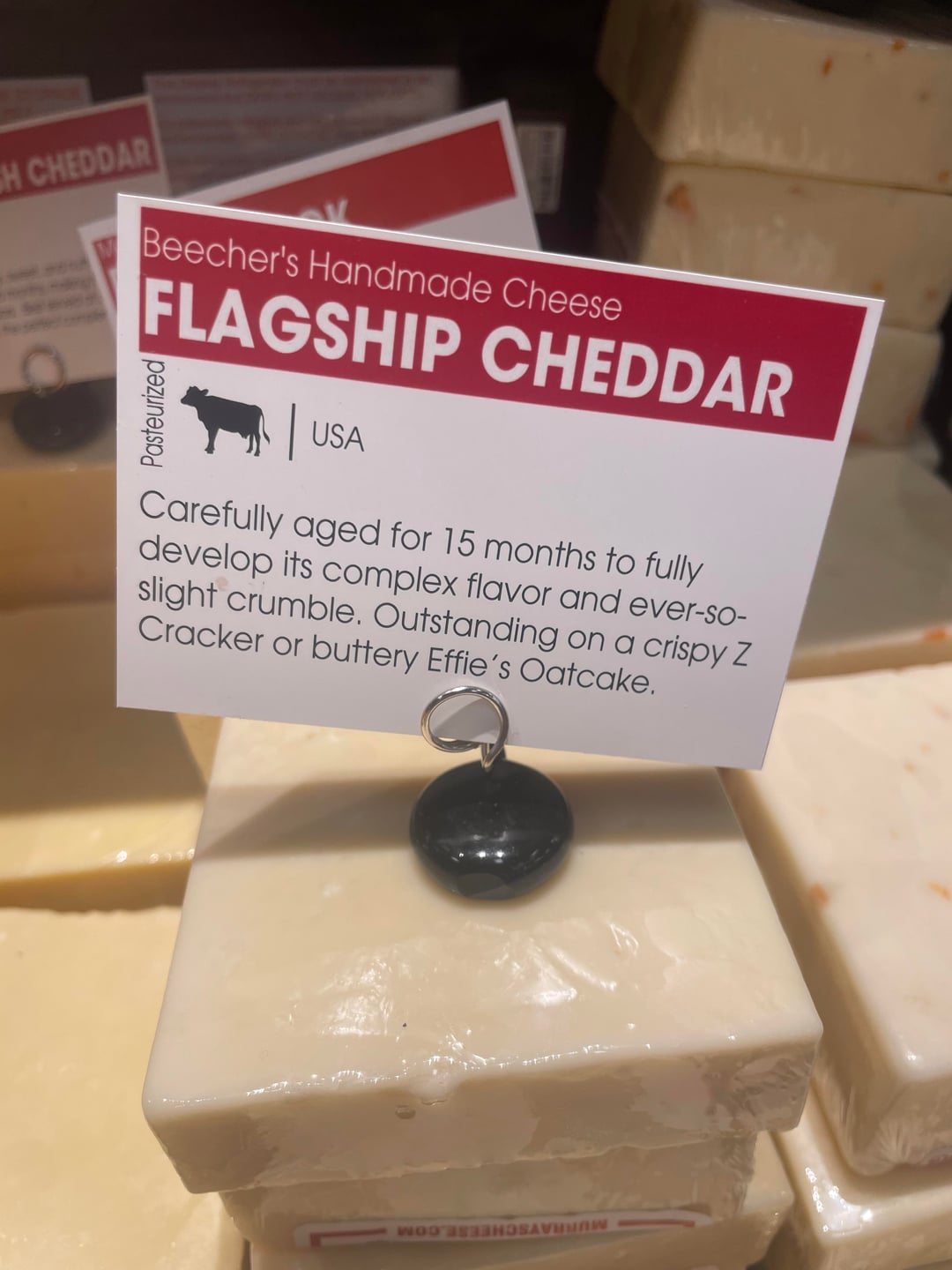 After having that underwhelming regular sharp white cheddar from Murray’s last night, I had to treat myself tonight to not one, but THREE cheeses to try and review for you all! I asked the cheese monger for any new and flavorful cheeses, and she immediately pointed me to the Claddagh-Bo cheddars. They look like very interesting, grass fed, Irish beauty’s. Then to top it off, I had to treat myself to a cheddar I’ve never tried yet, and it’s the Beechers Flagship cheddar. I’ve heard only great things from it and I can’t wait to try these when I get home!