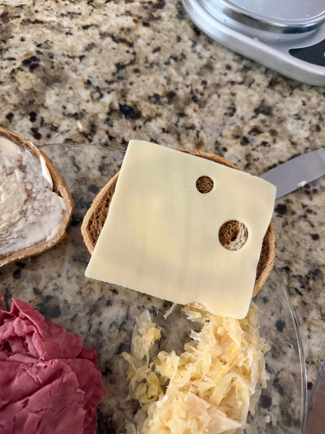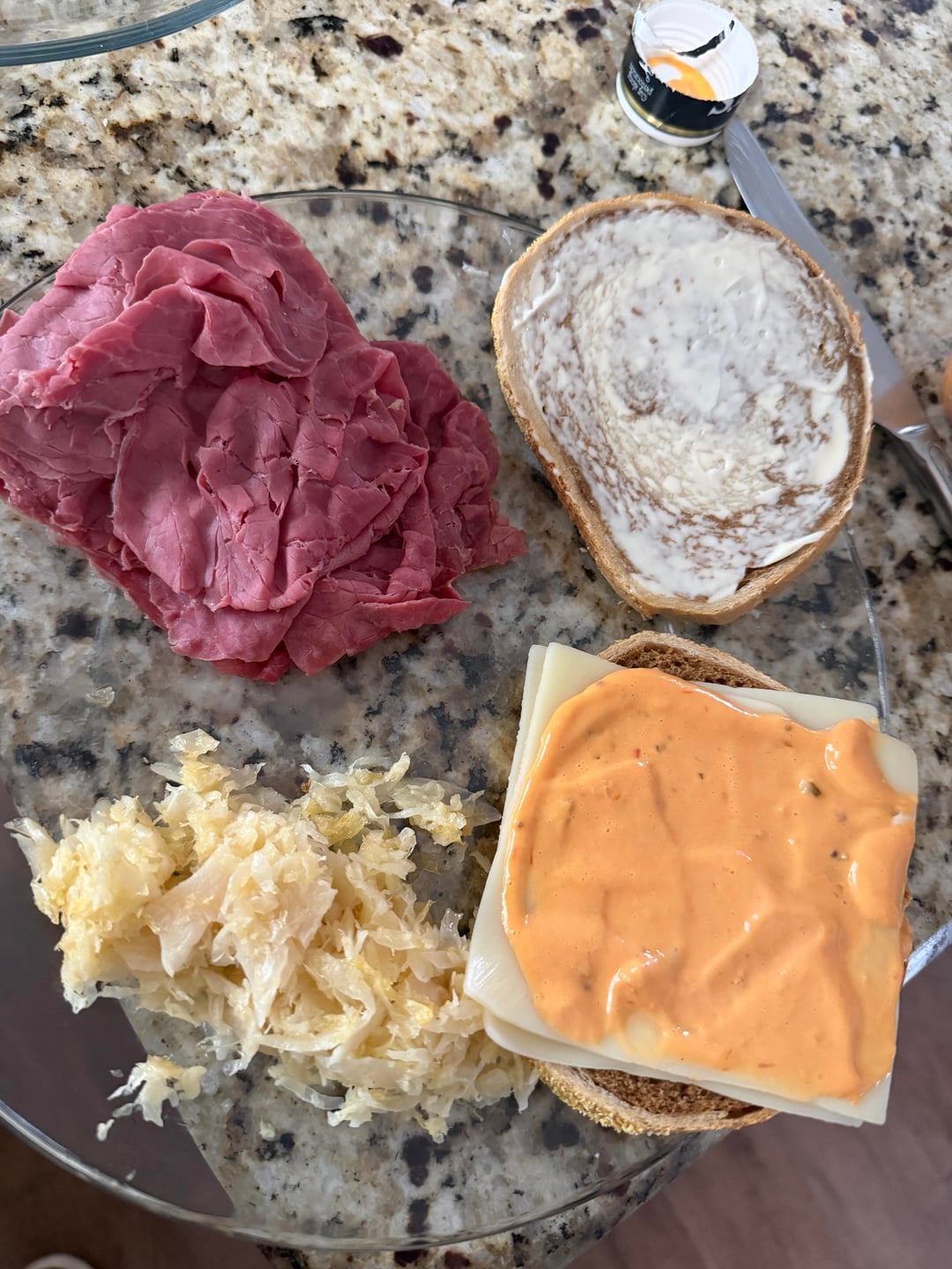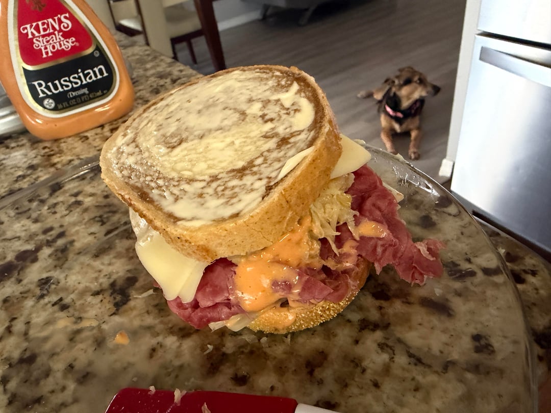 I ended up caramelizing the kraut in some butter, then I steamed the corned beef in a covered pan for about a minute. I put two slices of Swiss cheese on the inside and spread the Russian dressing on the cheese, then I assembled the whole sandwich. Spread some mayo on the outside and pan fried it in a covered pan for a little over a minute on each side.