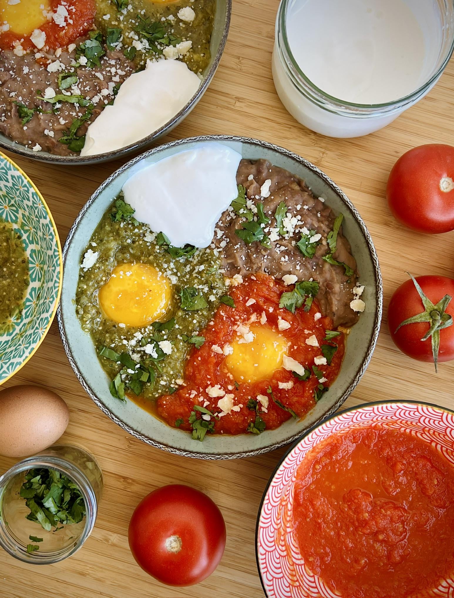 Hi everybody! I try to make mexican dishes this period of time, so couldn't pass this dish. Liked how it looks and combo of tastes (different salsas, eggs, beans, etc) so made it recently for a breakfast for me and my wife. This took some time while I made salsa roja, verde, refried beens, mexican creme, etc. But at the end it was tasty 🙂
