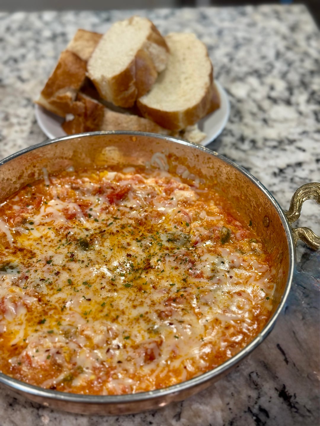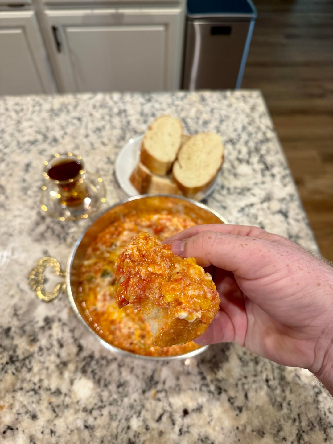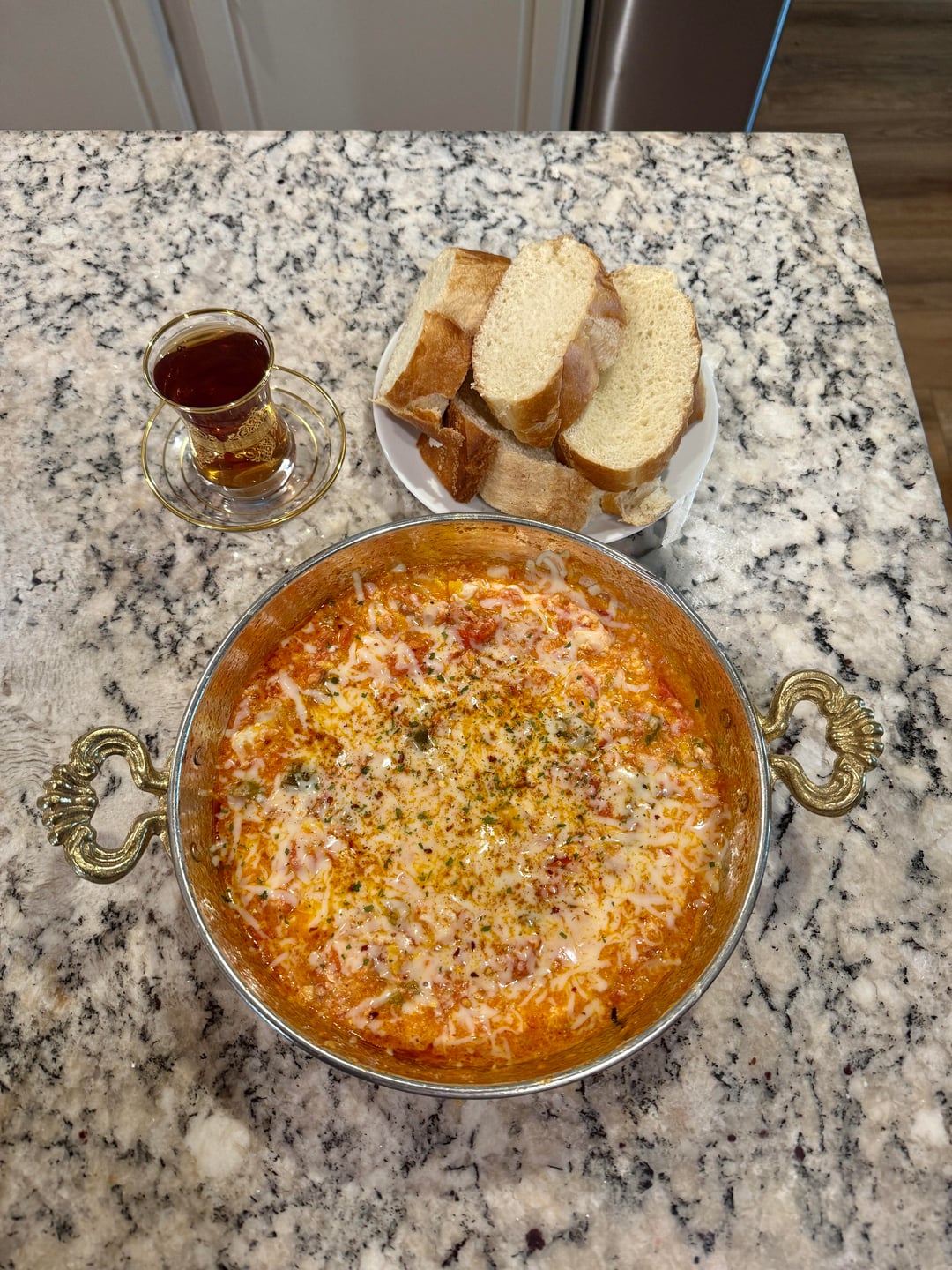 Made it with crushed tomato’s, green peppers, sujuk sausage, scrambled eggs and mozzarella cheese. Paired with some bread to scoop and a Turkish black tea straight from Türkiye.