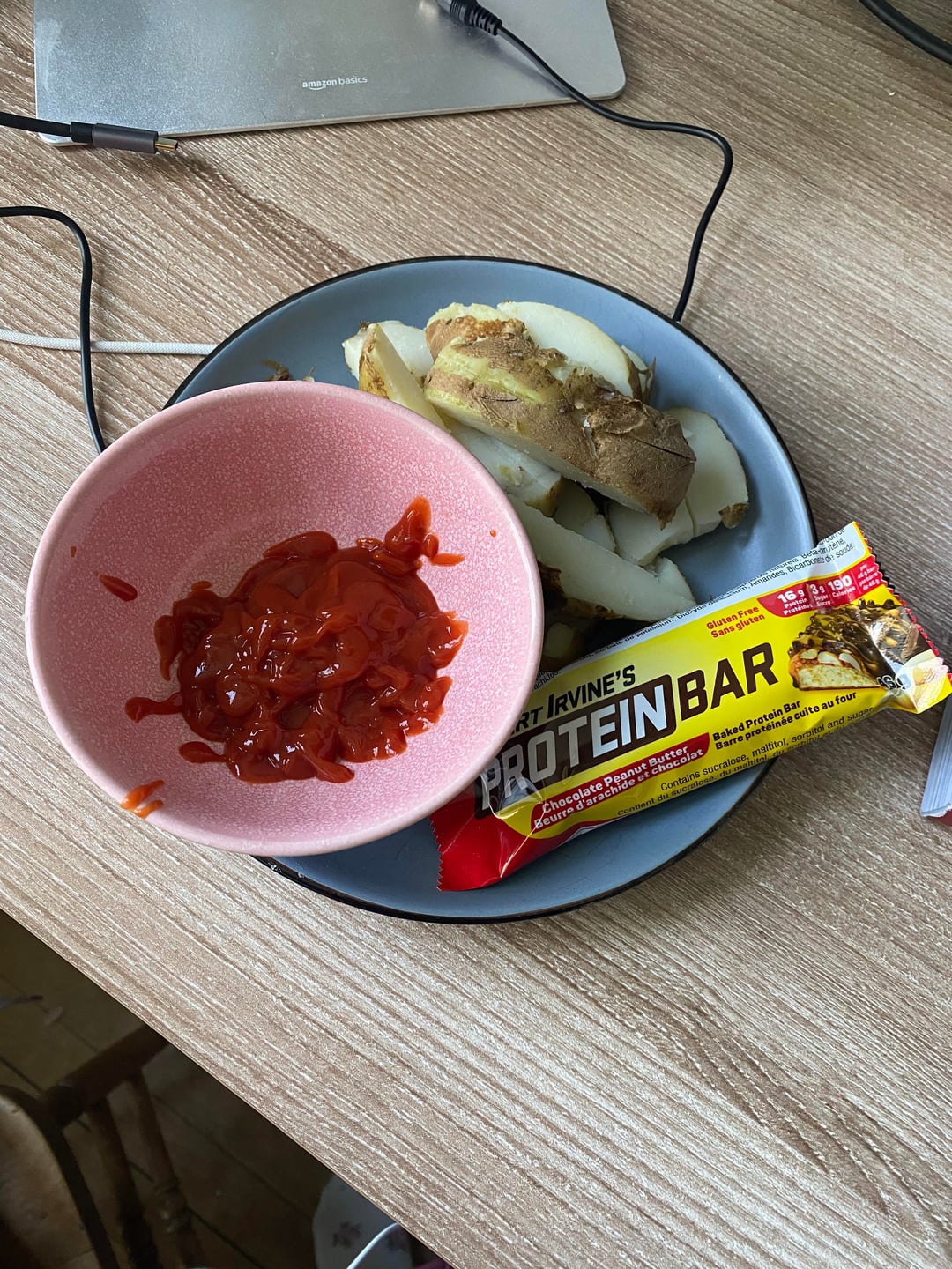 4. ⁠Two potatoes, ketchup, and a protein bar.