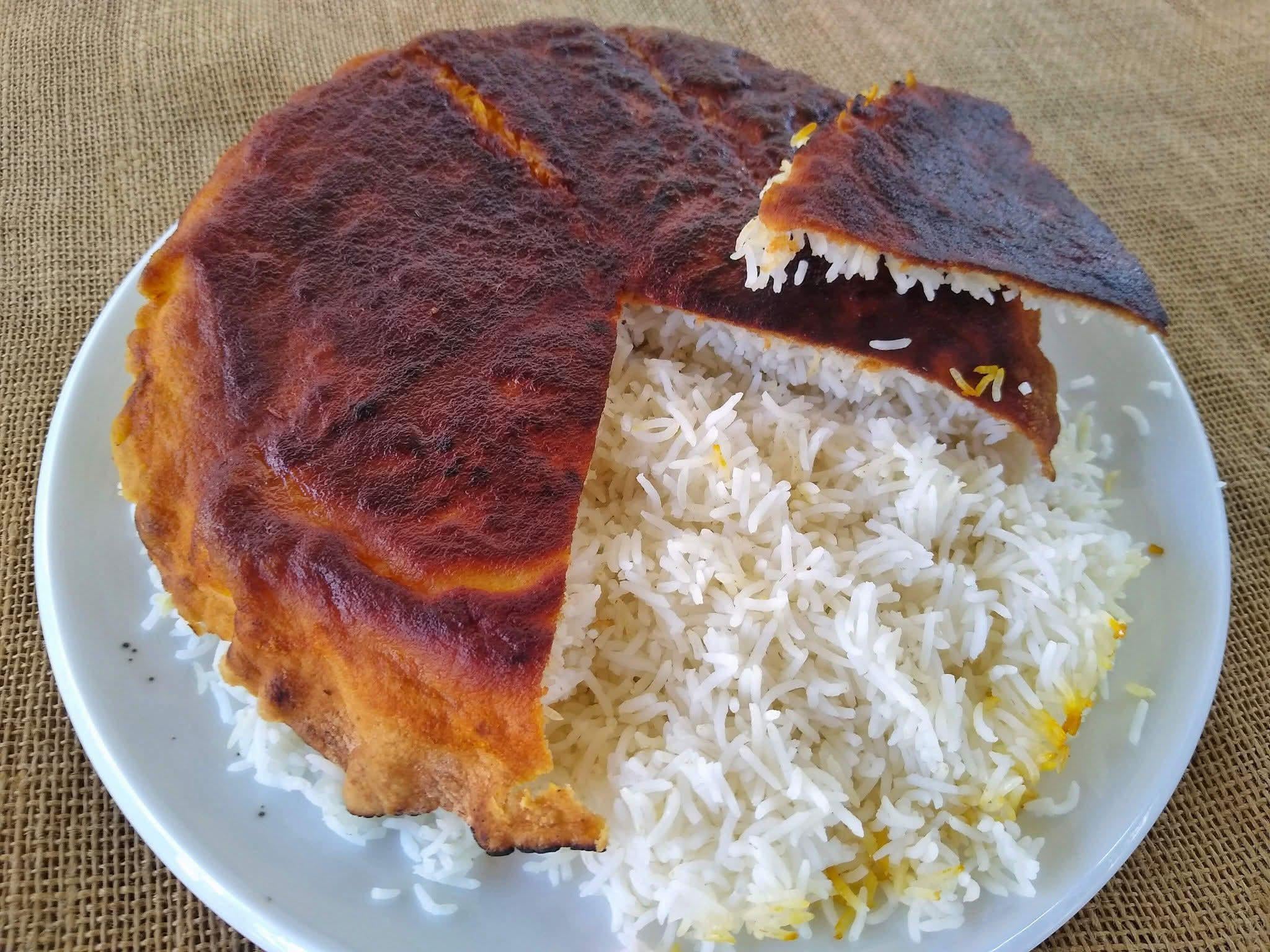 Melt vegan butter and olive oil in a pan, line it with pita bread, mound parboiled rice on top, cover, cook on high for 10 minutes, then on low for 30 to 40 more. Invert onto a platter in front of your guests with larger-than-life pageantry. It will either have a glorious, crispy, golden crust or an inedible burnt disc. Life goes on 😁