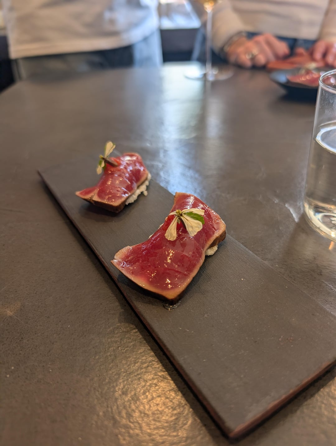 At 1:30 PM, we were escorted to the kitchen where Chef Maeda greeted us with three appetizers. Grilled leek, Chorizo Bao, and a riff on tuna tataki were all impeccable, highlighting basque ingredients with Japanese flair.