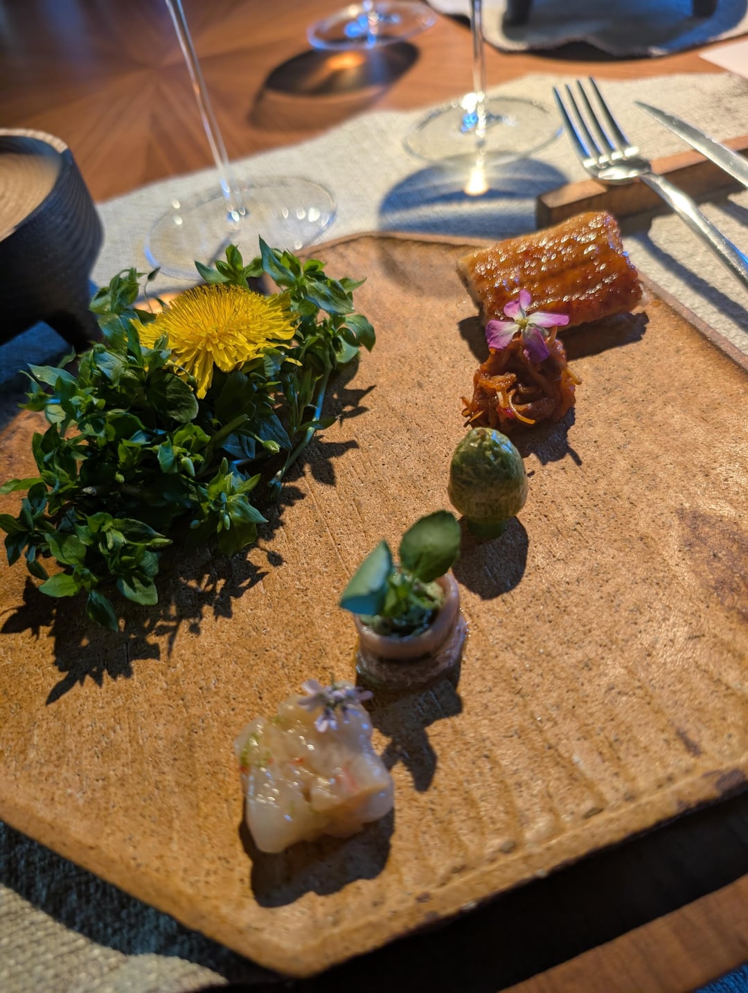 The Kinmedai fish with peri peri and Swiss Chard was one of the best dishes I've ever eaten. It was grilled immaculately, the flavors were wildly complimentary, and the technique was perfect. Additionally, the fresh spring trout with garden flowers was stunning, and the cleanest tasting trout I've ever experienced.