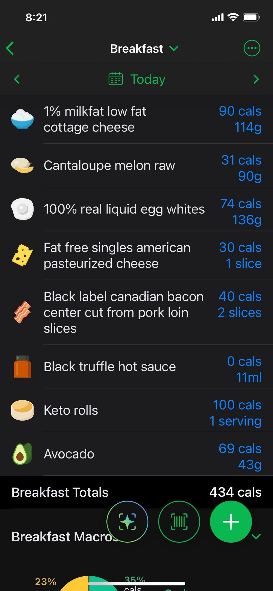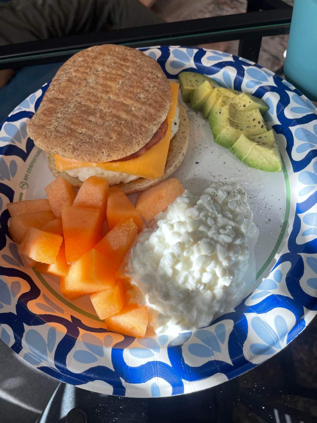 Breakfast – Egg white sandwich (keto sandwich roll, egg whites, 2 pieces of Canadian Bacon, fat free American Cheese, Melinda’s hot sauce), low fat cottage cheese, cantaloupe, avocado