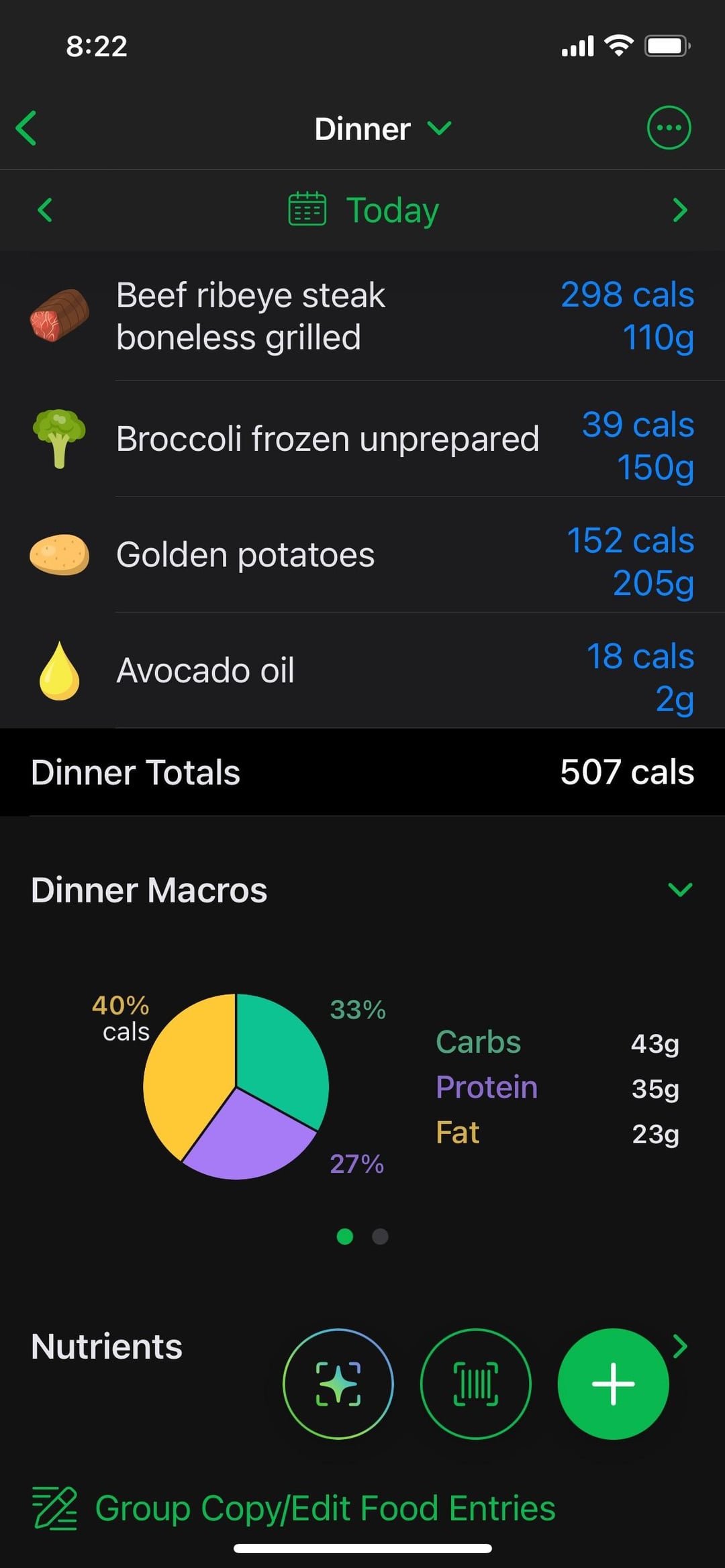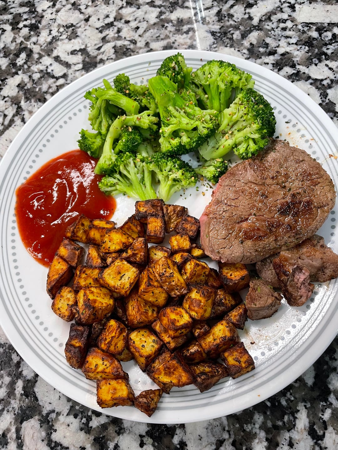 Dinner – Ribeye steak, Steamed Broccoli, Air Fried Golden Potatoes, G Hughes Ketchup