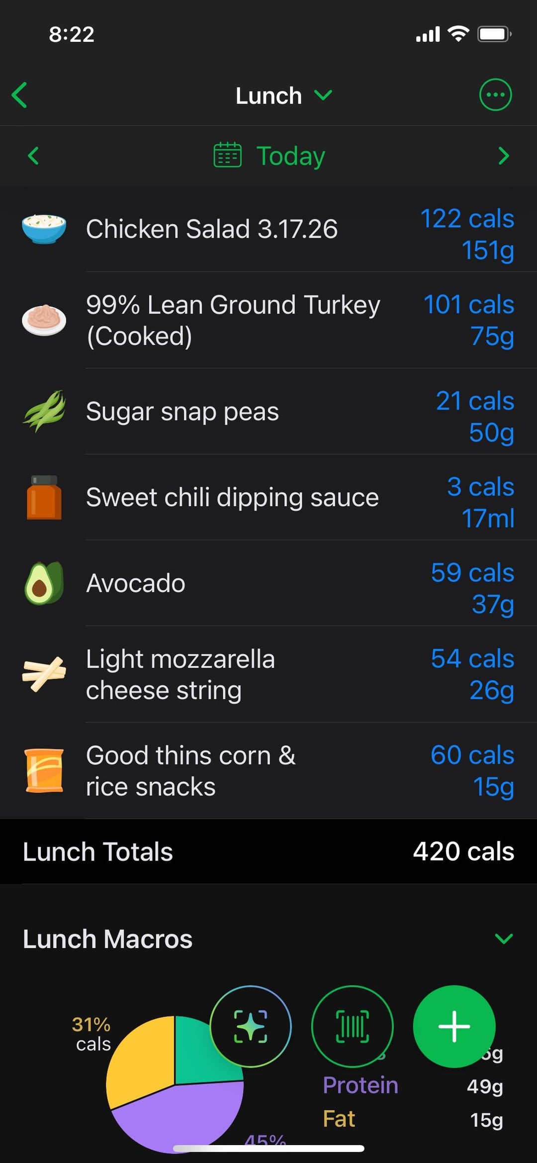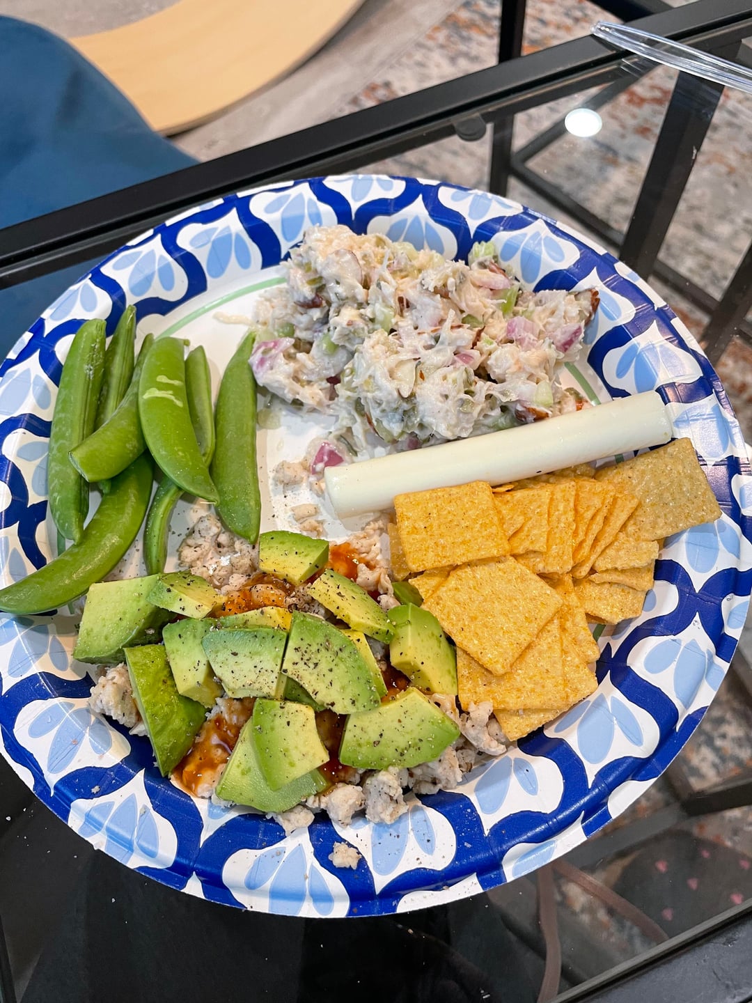 Lunch – Chicken Salad, Ground Turkey, G Hughes Sweet Chili Sauce, Avocado, String Cheese, Sugar Snap Peas, Corn Crackers