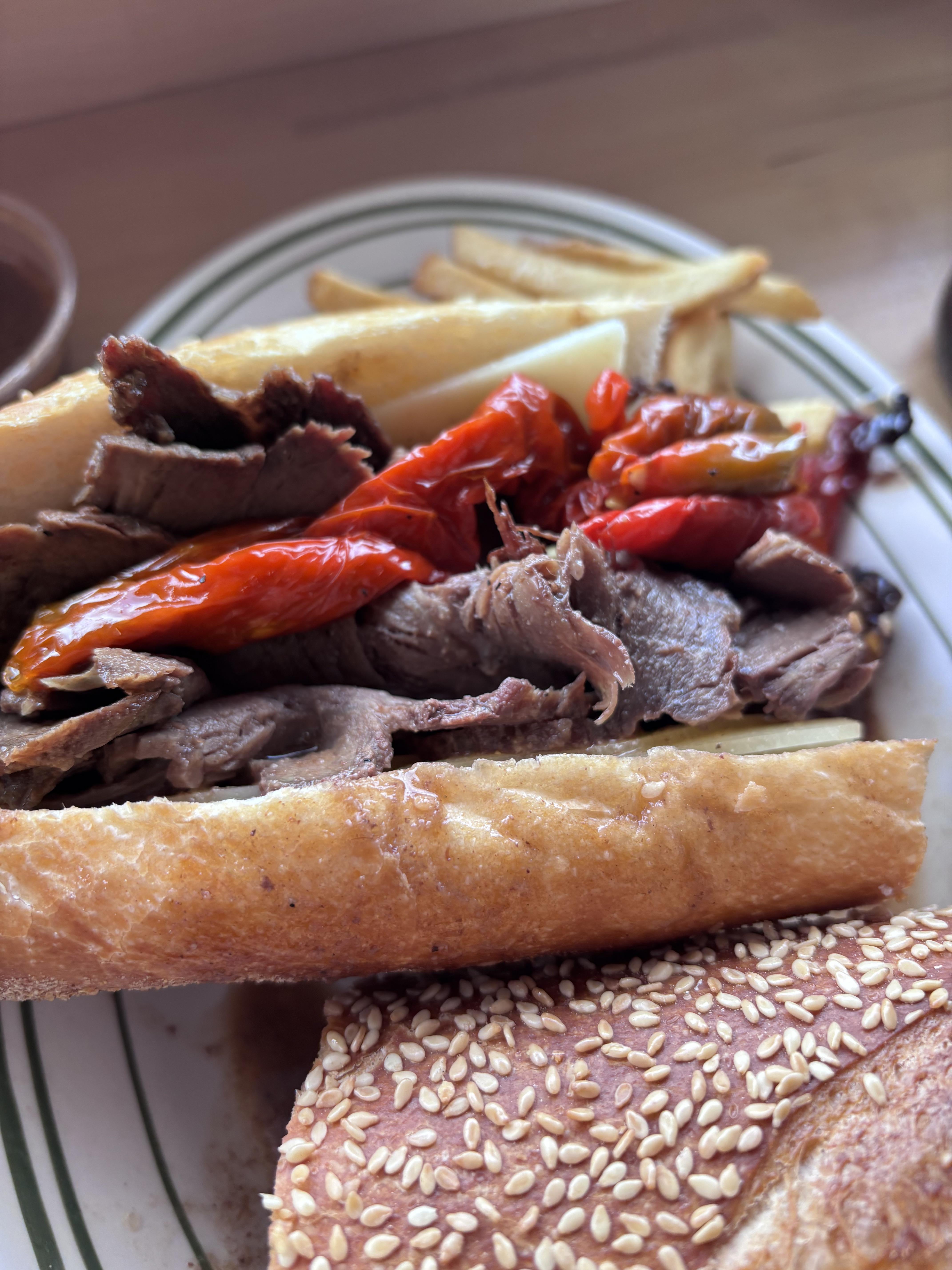 Hot roast beef on a house baked roll
